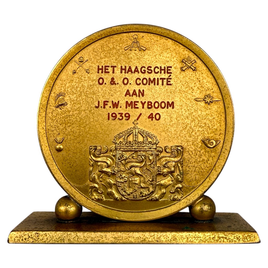 Deze bijzondere Nederlandse militaire tafelplaquette uit 1939–1940 is een historisch object uit de mobilisatieperiode aan de vooravond van de Tweede Wereldoorlog. De voorzijde toont een fraai uitgevoerd reliëf van een Nederlandse militair met helm, typerend voor het interbellum. Op de achterzijde staat de opdracht van het Haagsche O. & O. Comité aan J.F.W. Meyboom, als dank voor zijn grote steun aan de zwemactiviteiten van het Haagse garnizoen. De plaquette rust op een bijpassende sokkel met aanvullende inscriptie en is vervaardigd uit verguld brons of messing. Dit decoratieve stuk vormt een tastbare herinnering aan het sociale en sportieve leven binnen het Nederlandse leger in de jaren 1939–1940. Interessant voor verzamelaars van militaire memorabilia en Nederlandse geschiedenis.