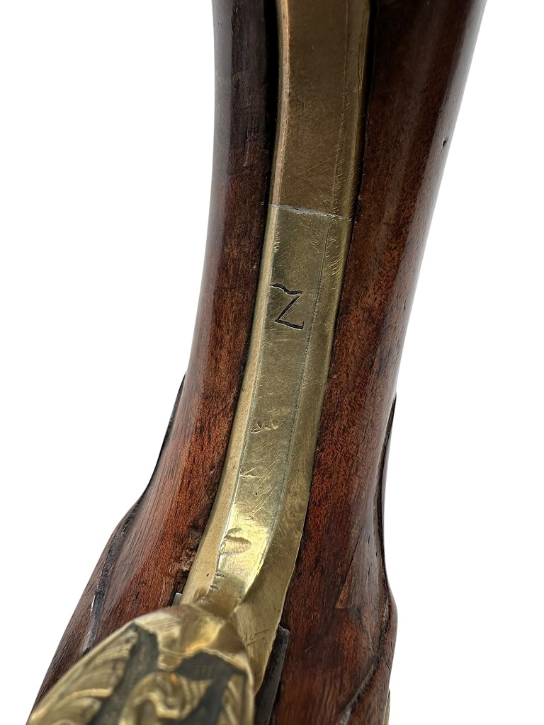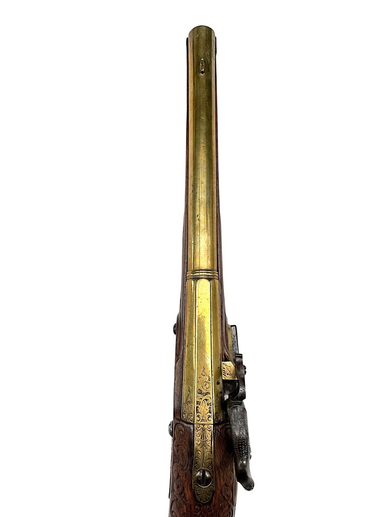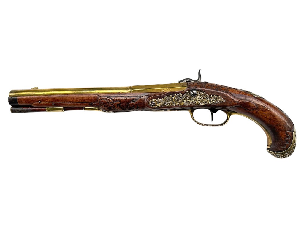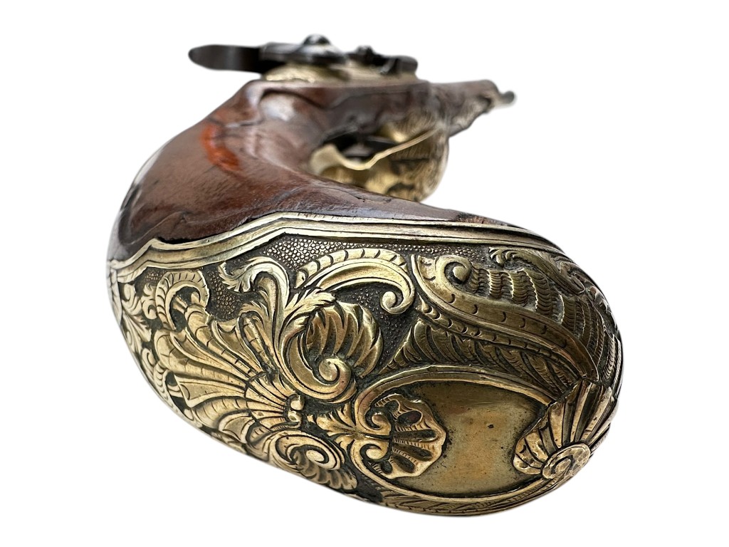 Notably, this piece shows strong stylistic similarities to pistols produced in the workshop of Oger Leblan, a prominent Maastricht gunmaker active in the 18th century and renowned for his elegantly shaped flintlocks, richly decorated brass furniture, and refined wood carvings.