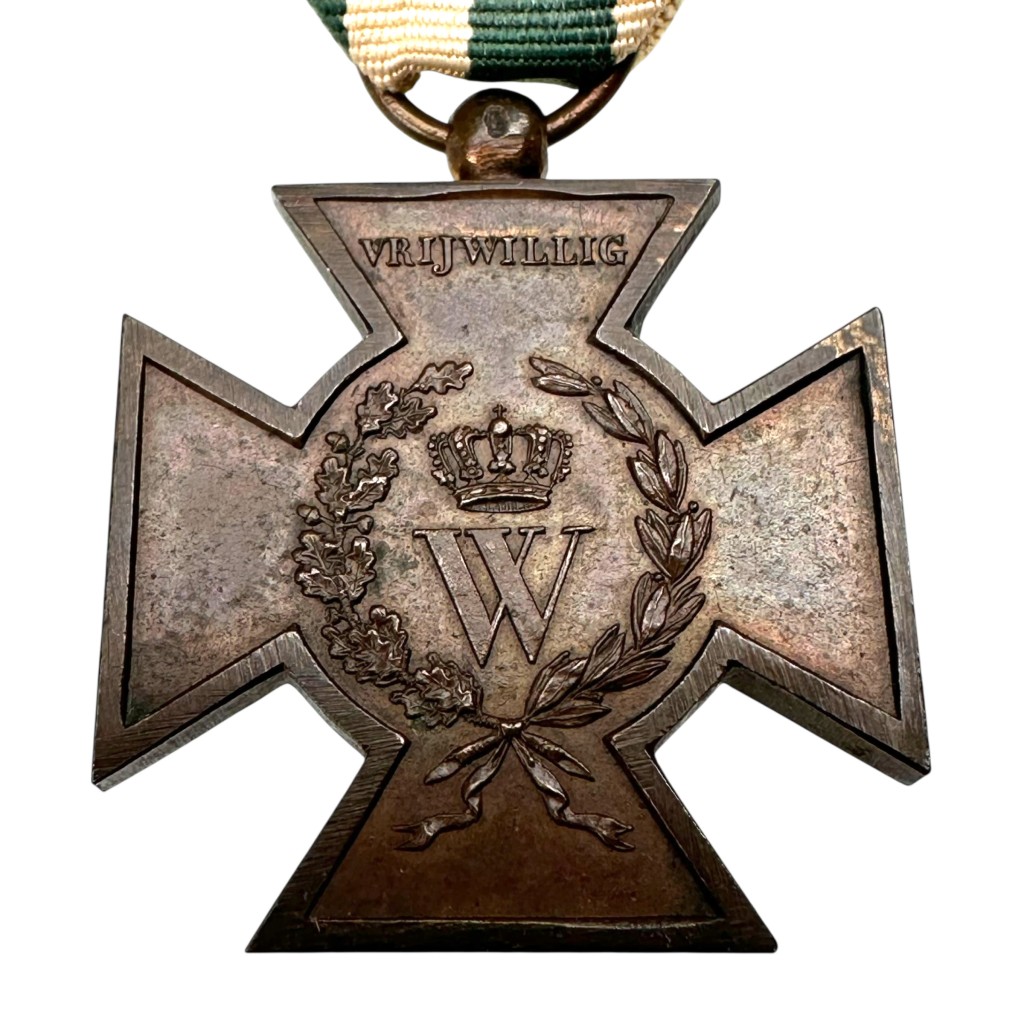 The cross-shaped medal features a crowned letter W on the obverse, surrounded by a laurel wreath and the inscription “Vrijwillig”.