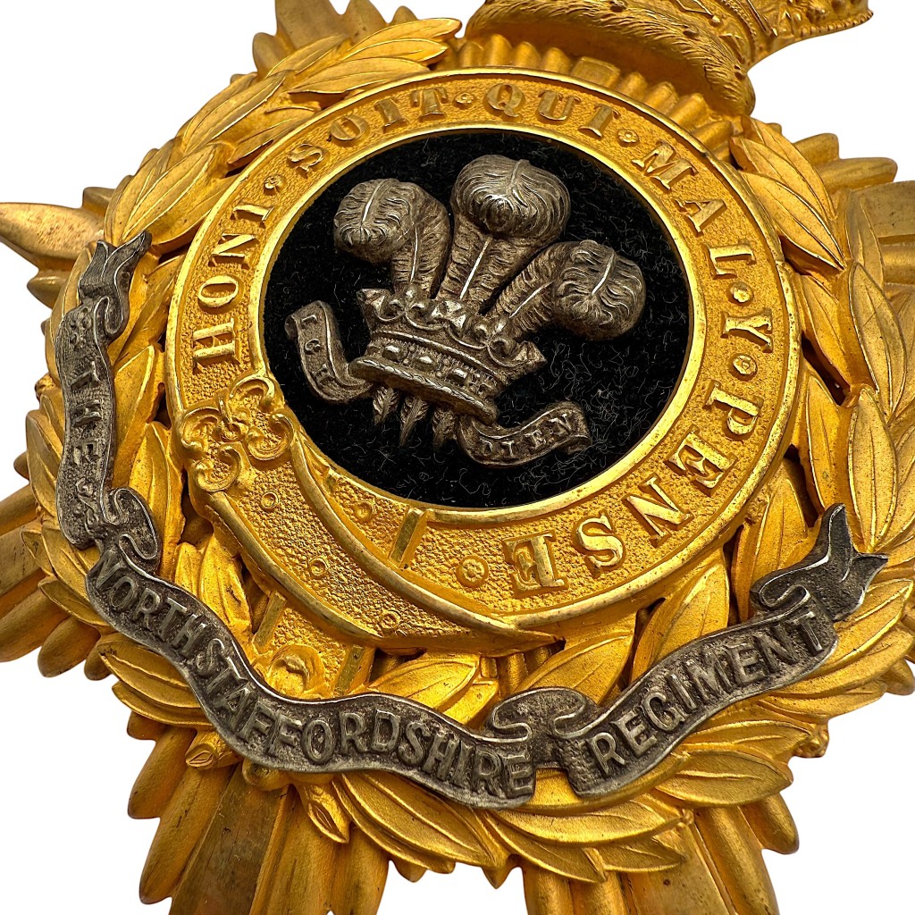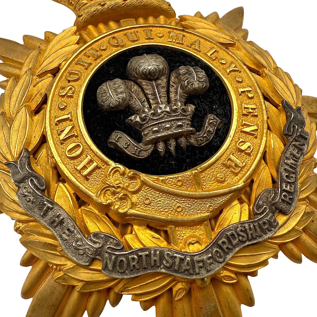 De vergulde lauwerkrans en stervormige achterplaat geven het geheel een indrukwekkende uitstraling, terwijl de zwarte banners met de regimentsnaam “The North Staffordshire Regiment” extra diepte en herkenning toevoegen.
