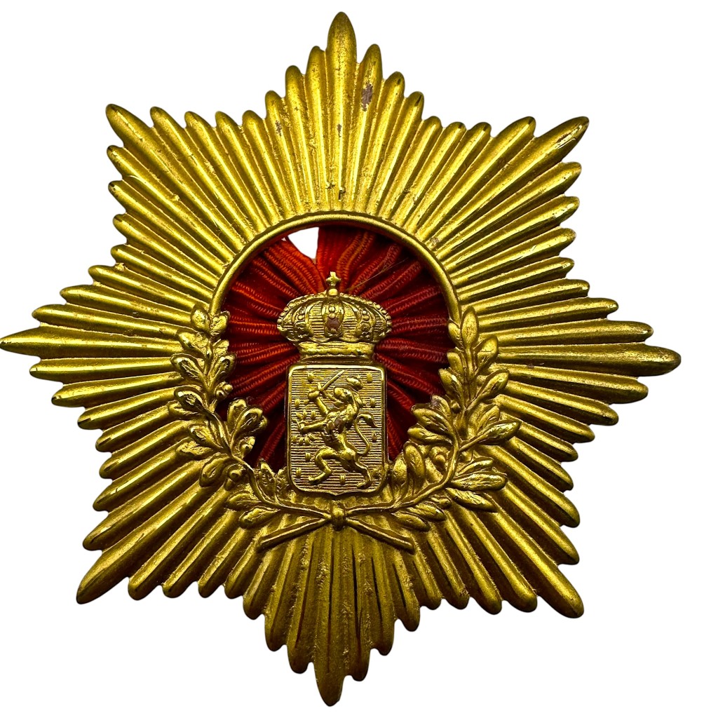 The design consists of a large gilt eight pointed star with a central red cockade field featuring the Dutch national coat of arms.
