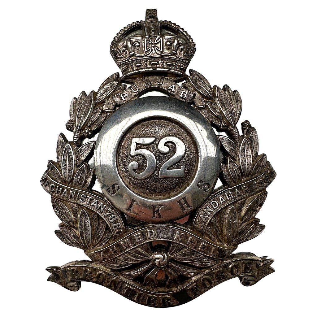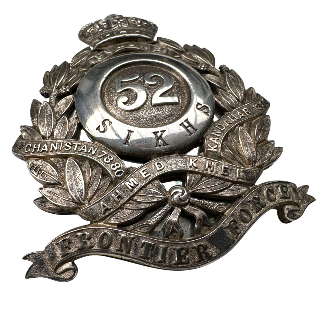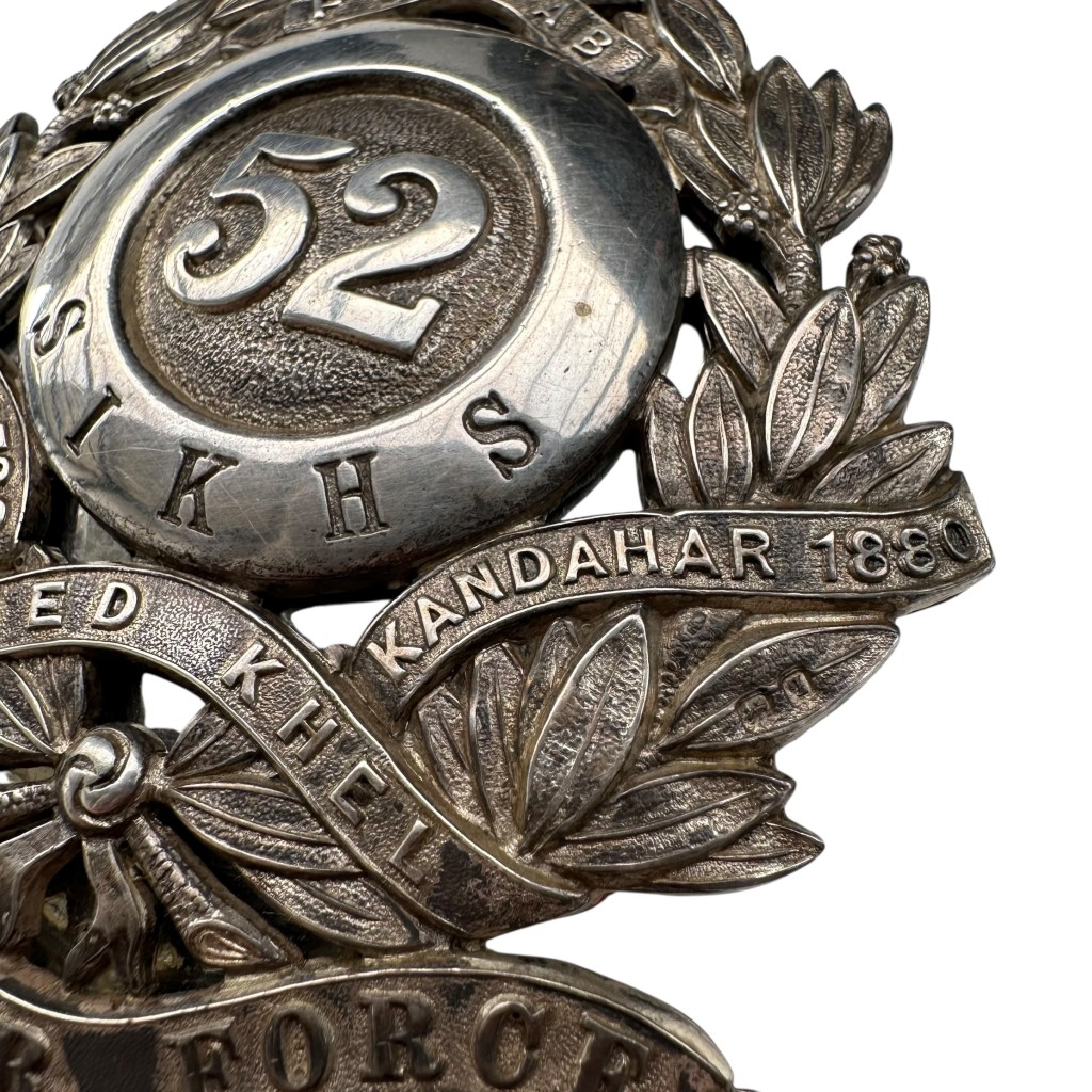 Dit rijk uitgevoerde regimentsinsigne toont centraal het regimentsnummer “52” binnen een quoit met de titel “Sikhs”, omgeven door een lauwerkrans met ineengestrengelde banderollen dragend de gevechtsonderscheidingen “Punjab”, “Afghanistan 1878–80”, “Ahmed Khel” en “Kandahar 1880”.