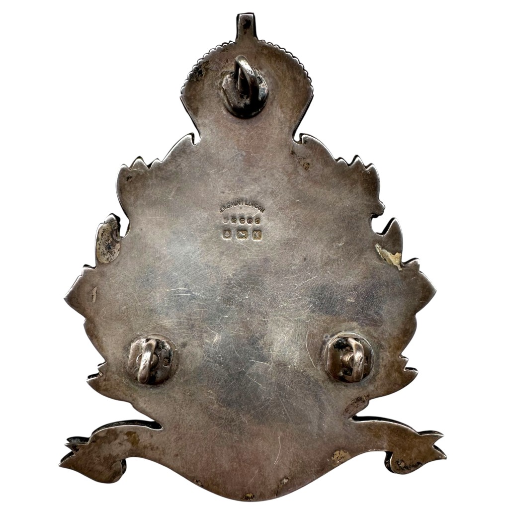 This richly executed regimental insignia features the regimental number “52” centrally within a quoit bearing the title “Sikhs”, surrounded by a laurel wreath with intertwined scrolls displaying the battle honours “Punjab”, “Afghanistan 1878–80”, “Ahmed Khel” and “Kandahar 1880”. The whole is surmounted by a King’s Crown and finished with a lower scroll bearing the title “Frontier Force”. The piece is crafted in silver and carries clear hallmarks on the reverse, along with the maker’s mark of J.R. Gaunt London, a renowned manufacturer of British military insignia.