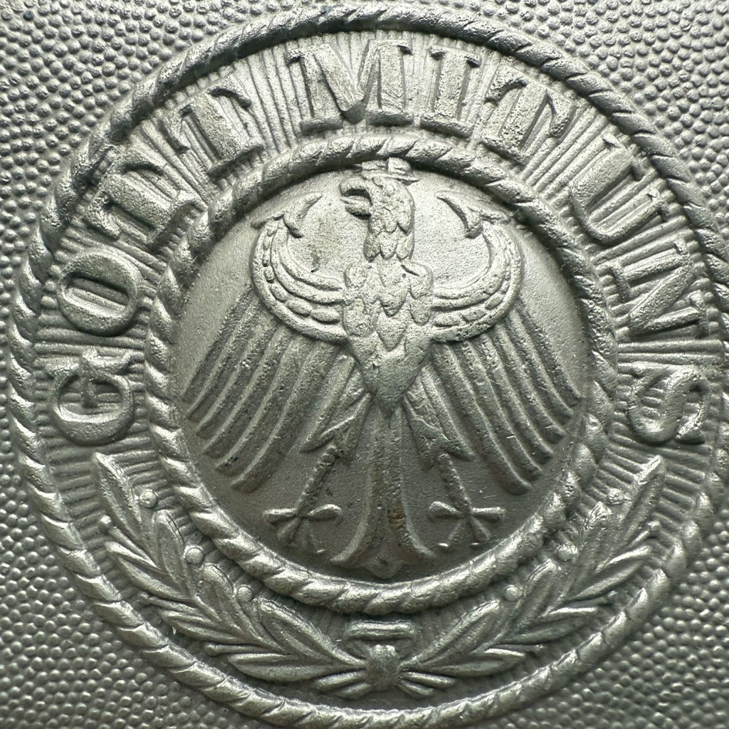 Het slot is voorzien van het kenmerkende Reichsadler-embleem, omgeven door een krans en het opschrift “Gott mit uns”, scherp en duidelijk zichtbaar.