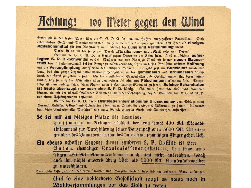 Dit drukwerk werd verspreid tijdens de periode waarin de NSDAP verboden was na de mislukte Bierkellerputsch en via de NSFB toch politiek actief bleef.