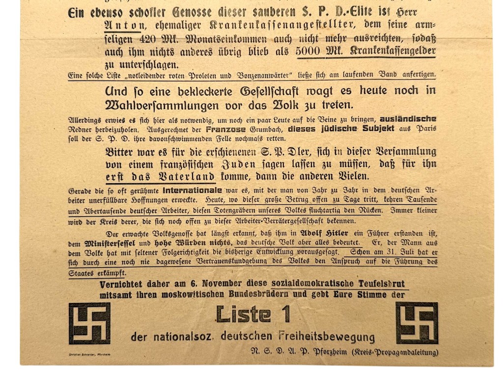 De flyer roept op om te stemmen op “Liste 1 der nationalsoz. deutschen Freiheitsbewegung” en bevat duidelijke propagandistische teksten tegen politieke tegenstanders zoals de SPD.