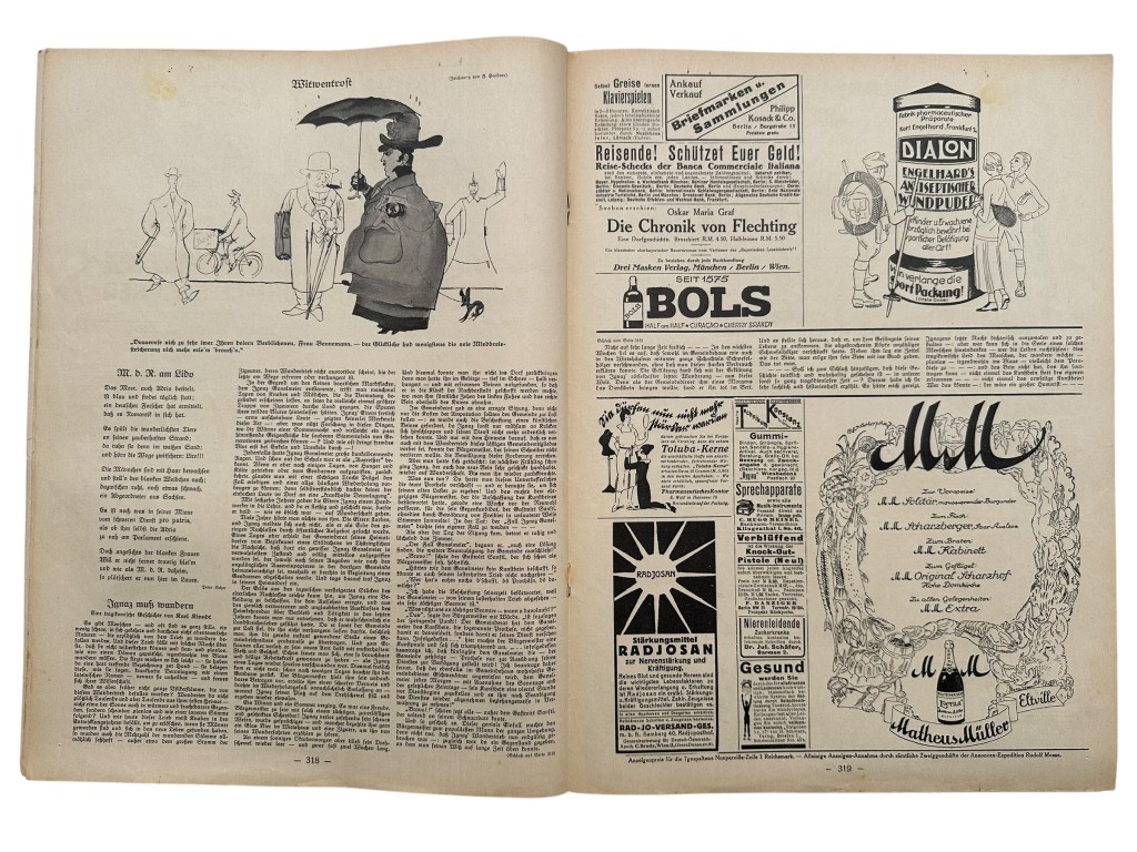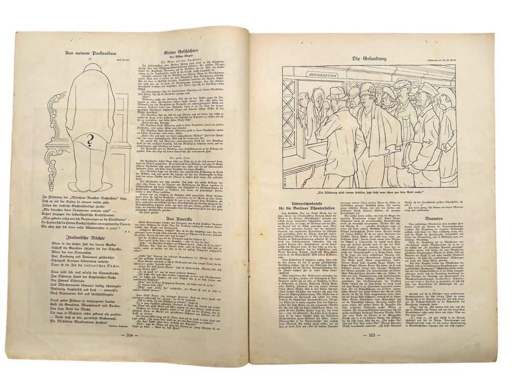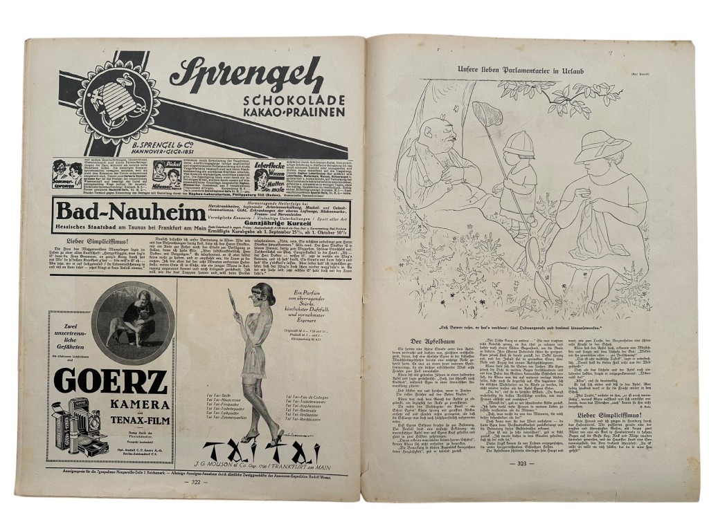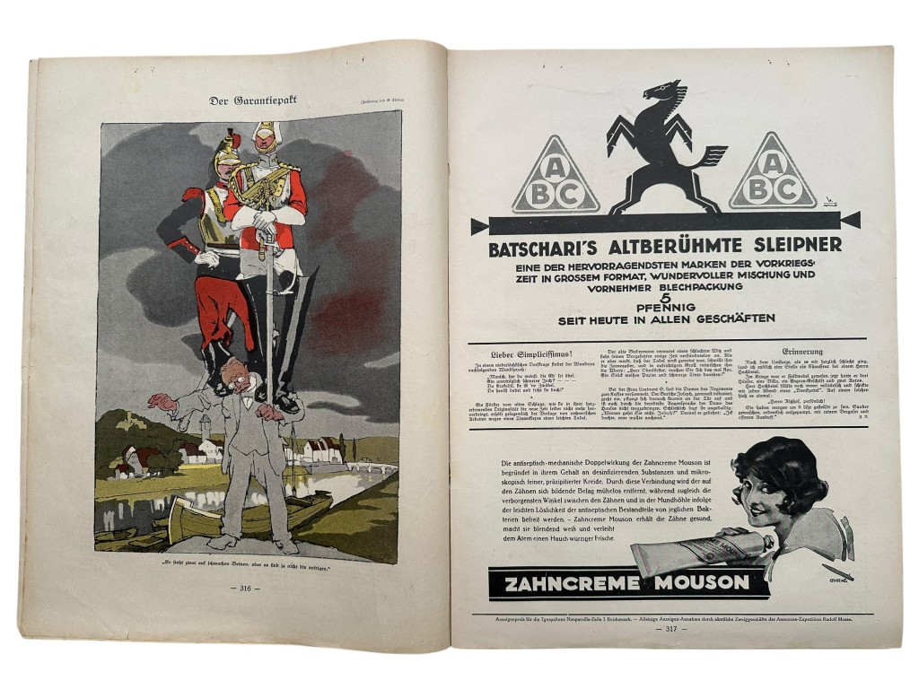Origineel exemplaar van het Duitse satirische weekblad Simplicissimus, uitgegeven in Stuttgart op 31 augustus 1925.