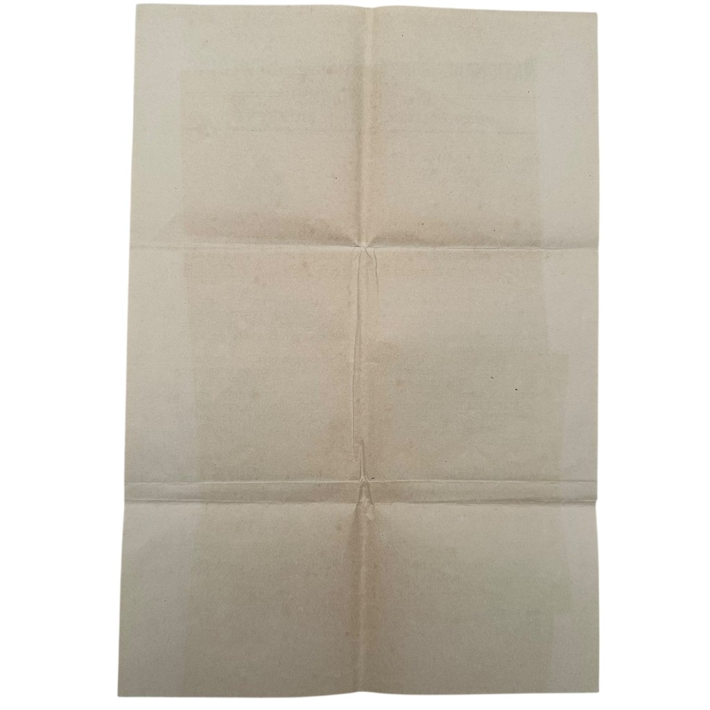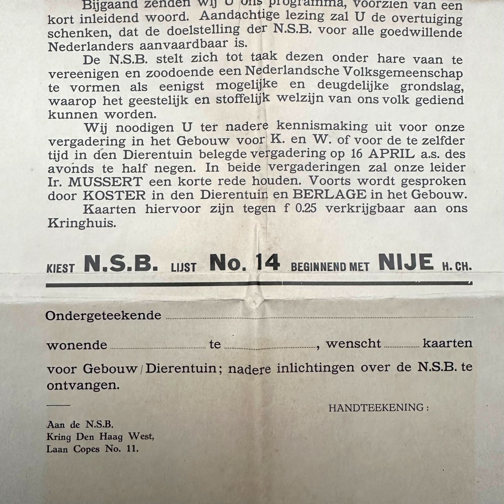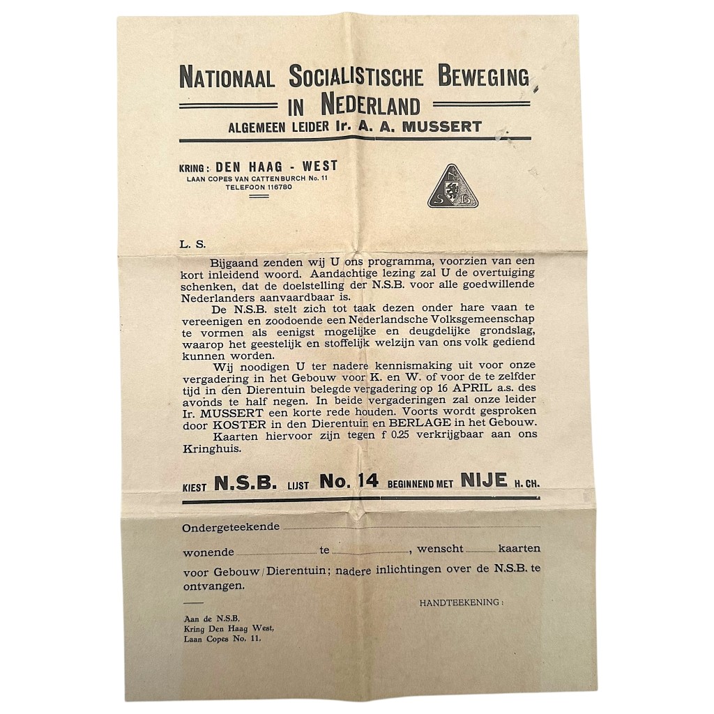 Nederlandse papieren flyer van de Nationaal-Socialistische Beweging (NSB), daterend uit de jaren 30, uitgegeven in het kader van de verkiezingen. Dit exemplaar is afkomstig van Kring Den Haag-West en vermeldt Ir. A. A. Mussert als algemeen leider. De flyer bevat een uitnodiging en toelichting op bijeenkomsten en lezingen, met duidelijke propagandistische inhoud zoals kenmerkend voor de NSB-campagnes in aanloop naar de verkiezingen in het vooroorlogse Nederland. De opmaak, tekst en regionale gegevens maken dit tot een representatief en historisch relevant stuk politieke propaganda uit de jaren dertig. Een interessant verzamelobject voor verzamelaars van Nederlandse politieke geschiedenis, NSB-memorabilia, verkiezingspropaganda uit de jaren 30 en aanloopmateriaal naar de Tweede Wereldoorlog.