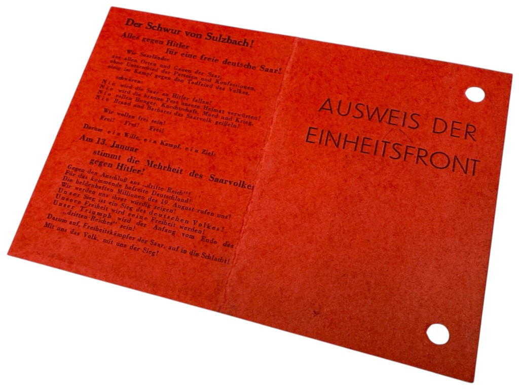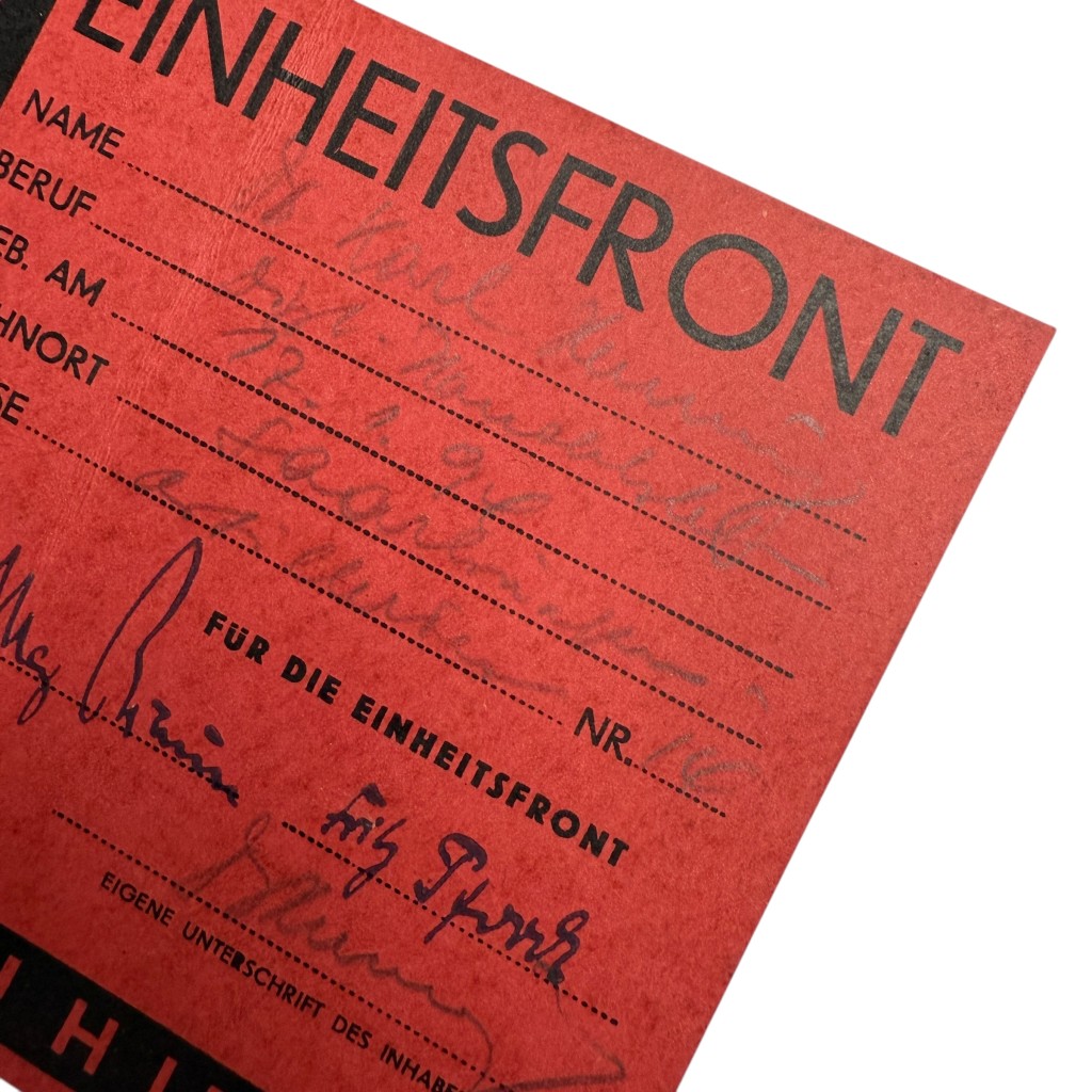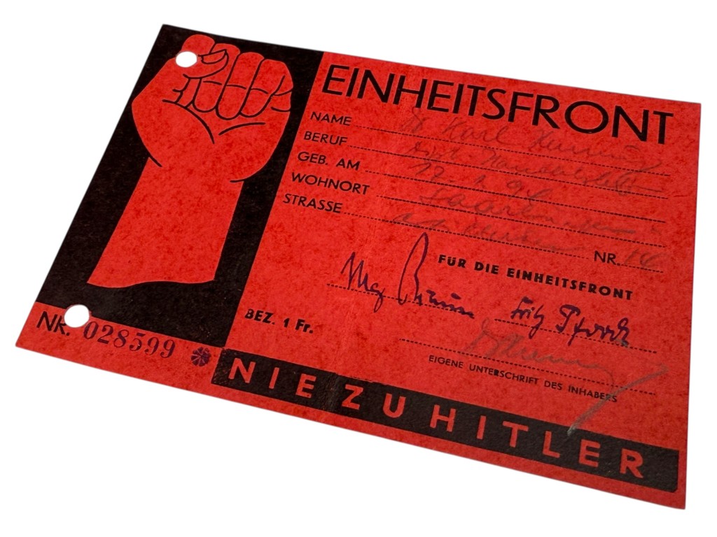 Deze zeldzame Einheitsfront Ausweis is een lidmaatschapsbewijs van het Einheitsfront, de socialistische en communistische arbeidersbeweging die zich in de jaren 1930 verenigde in de strijd tegen het nationaalsocialisme en Adolf Hitler.