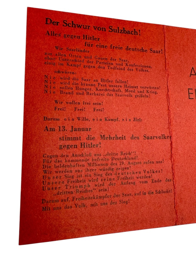 The bright red card, featuring the iconic raised fist as a symbol of solidarity and resistance, bears the inscription “Nie zu Hitler”, a powerful call for unity against the threat of fascism. Inside is the text “Der Schwur von Sulzbach” (“The Oath of Sulzbach”), a patriotic pledge in which members swore loyalty to the cause of freedom and an independent, democratic Saar region.
