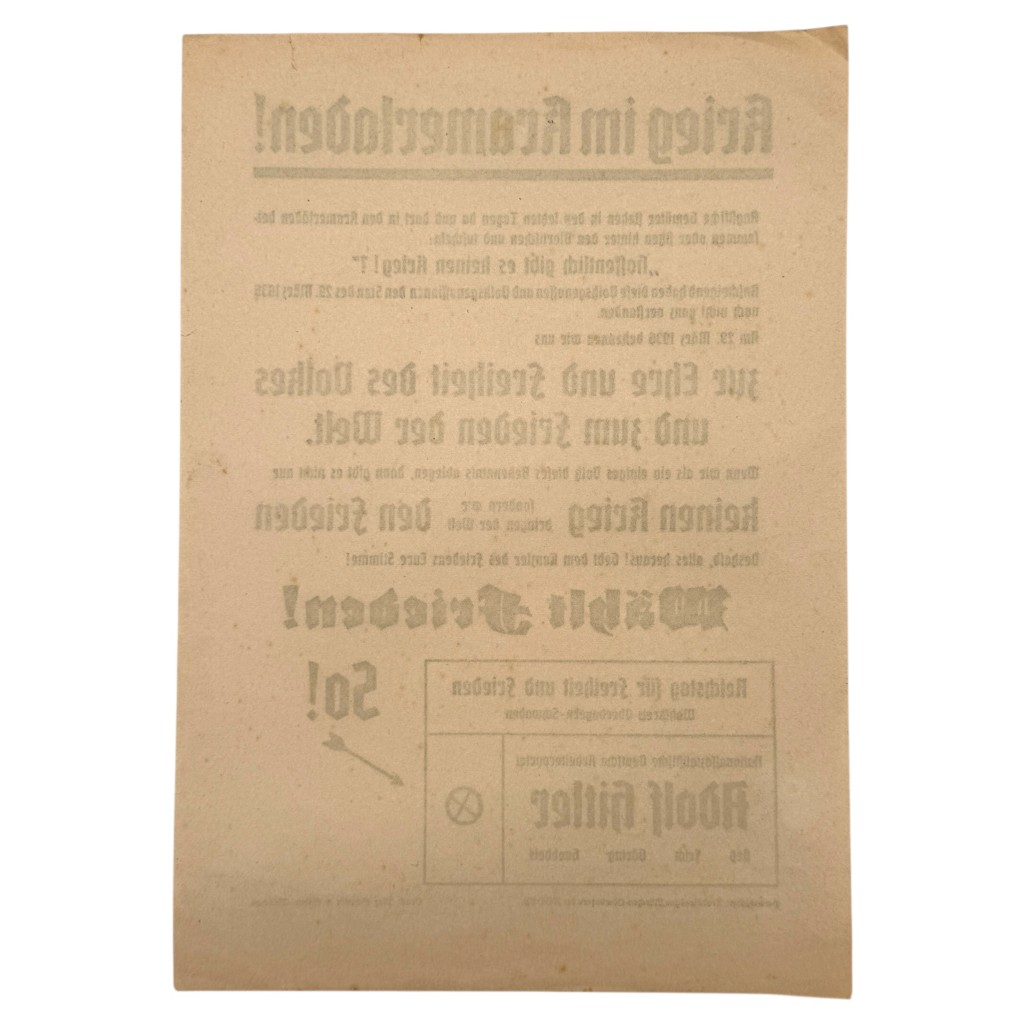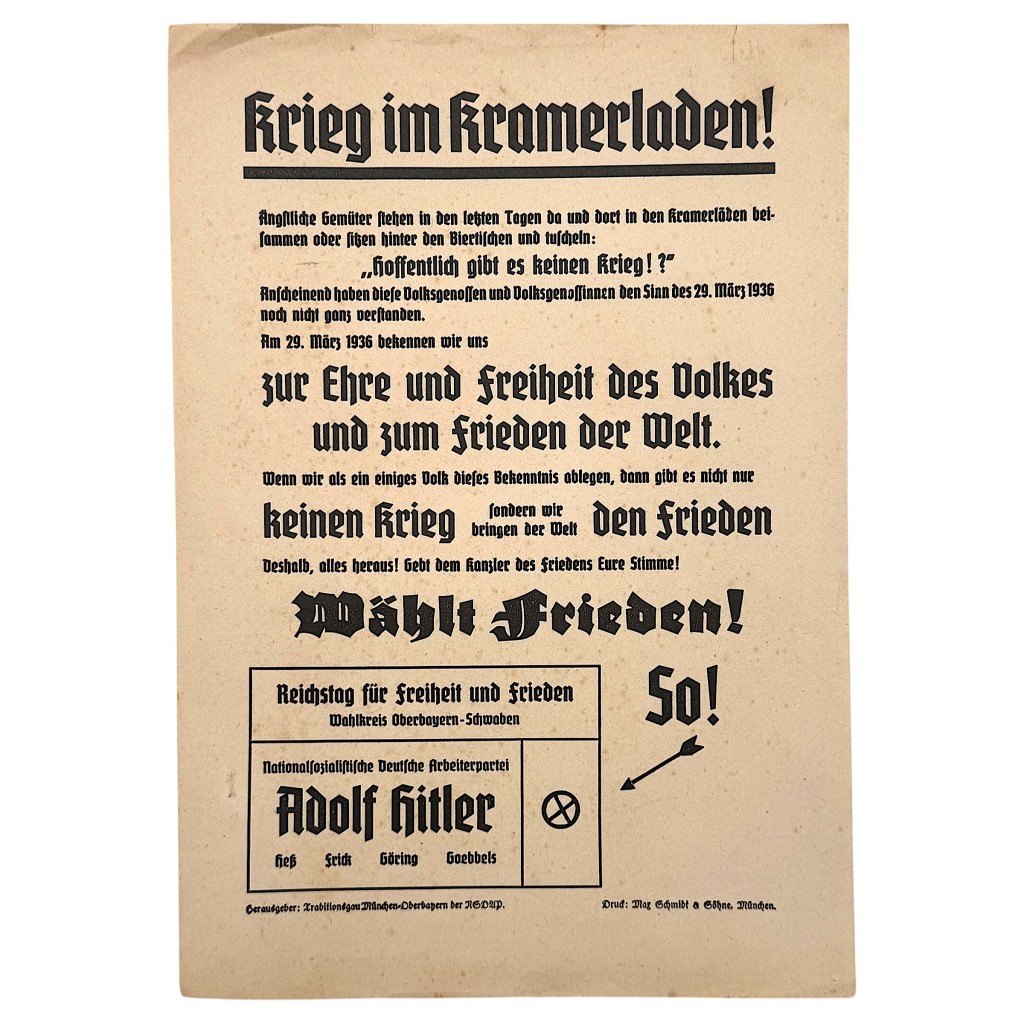 This German propaganda leaflet “Krieg im Kramerladen!” from the 1930s is an early National Socialist election publication issued by the Traditionsgau München–Oberbayern of the NSDAP. The leaflet responds to public anxiety at the time about a possible war and presents the National Socialist message that the elections of 29 March 1936 would contribute to “honour, freedom, and peace for the German people.” Featuring large Gothic slogans, clear voting instructions, and references to Adolf Hitler and prominent party figures, the leaflet was designed to persuade voters to support the NSDAP.