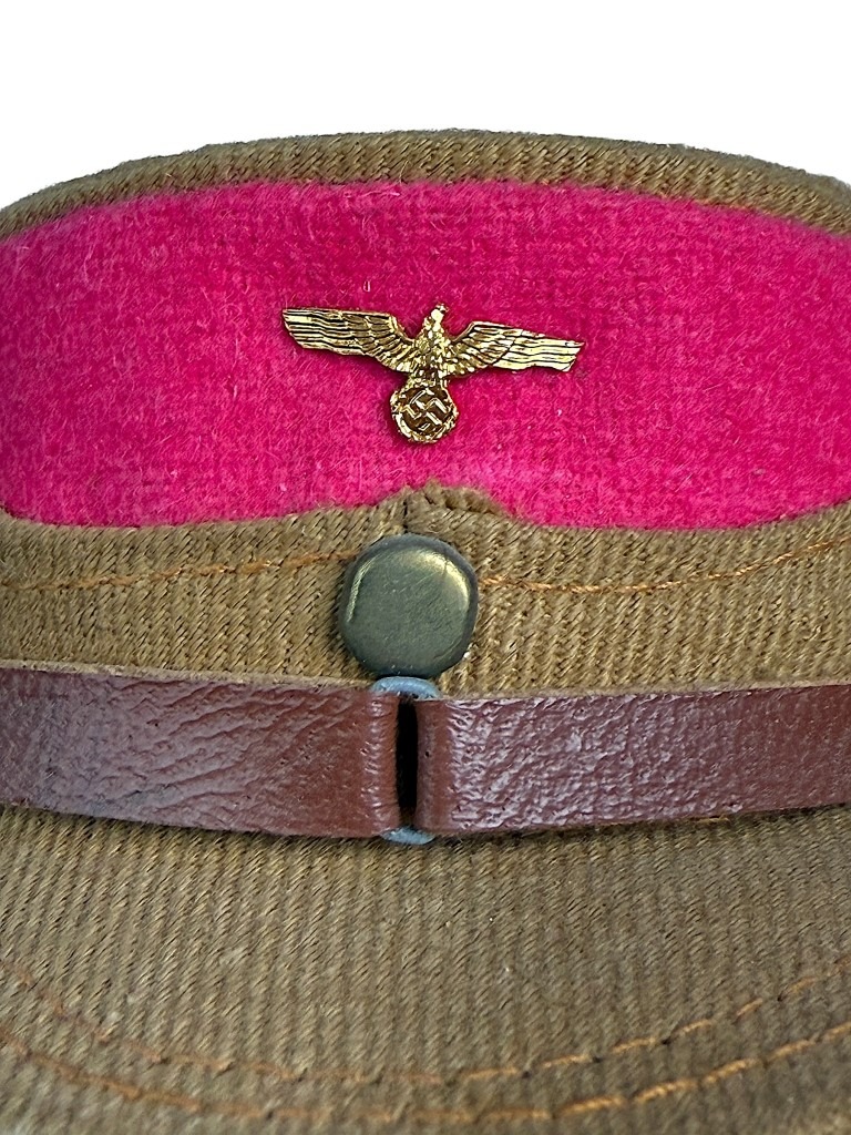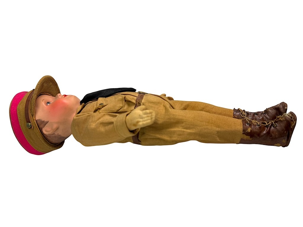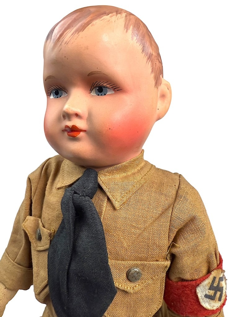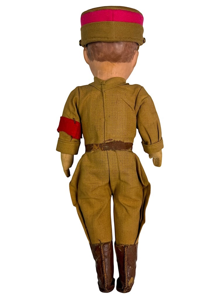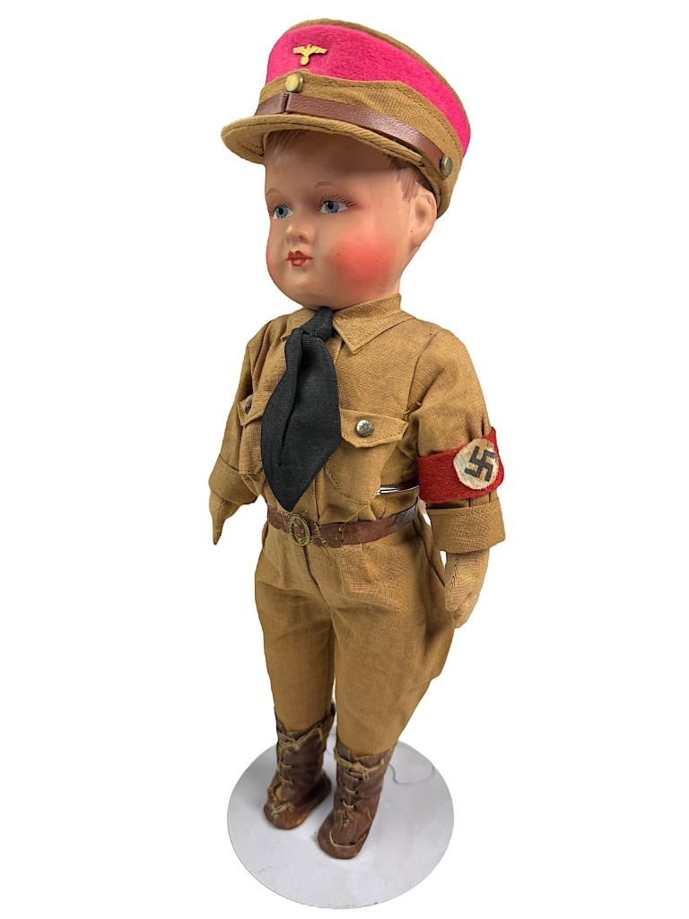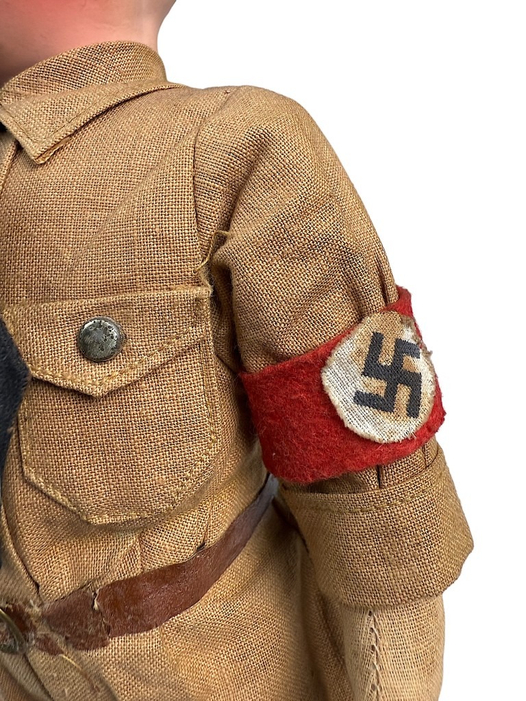 The doll has a painted face with rosy cheeks and blue eyes, and wears the original fabric uniform with matching armband, leather boots, and a cap with eagle insignia.