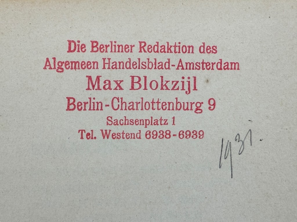 Op de binnenzijde staat zijn stempel als correspondent in Berlijn voor het Algemeen Handelsblad.
