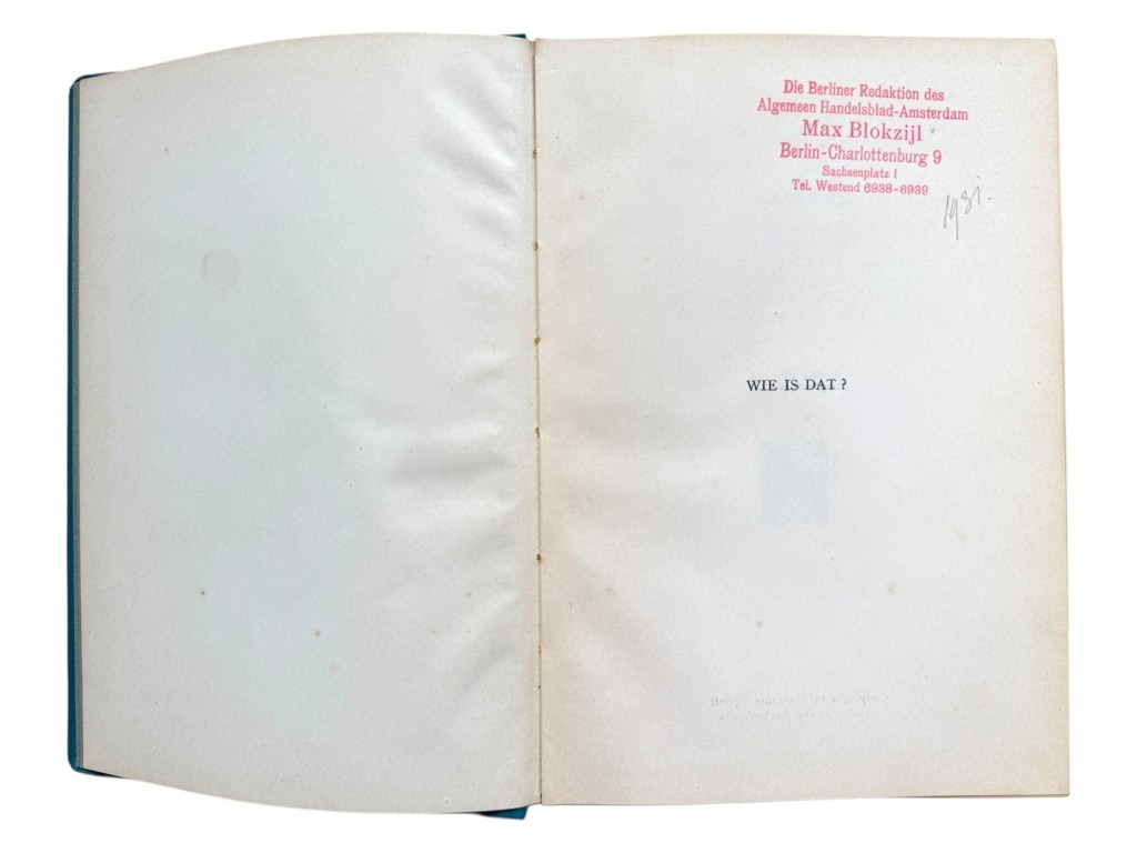 This particular copy originates from the personal library of Max Blokzijl. On the inside it bears his stamp as correspondent in Berlin for the Algemeen Handelsblad.