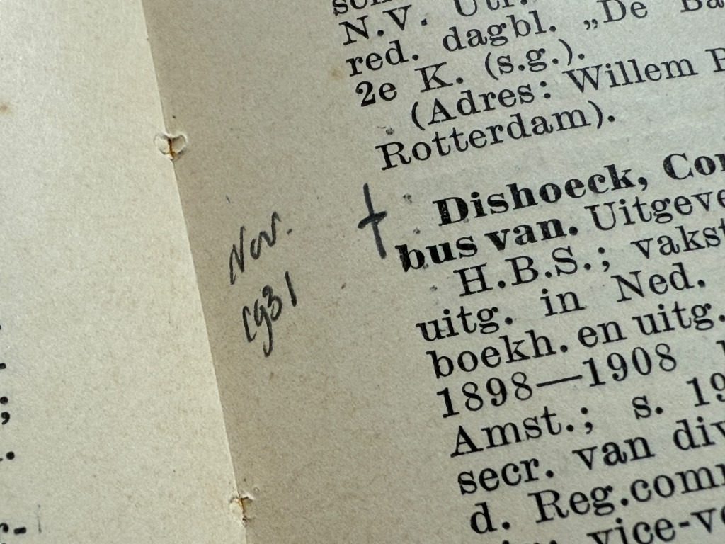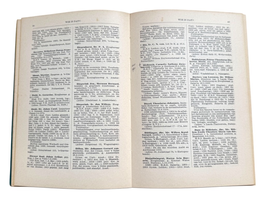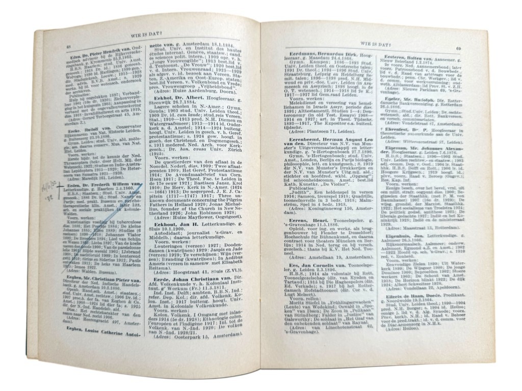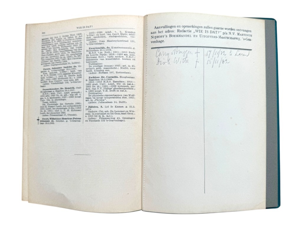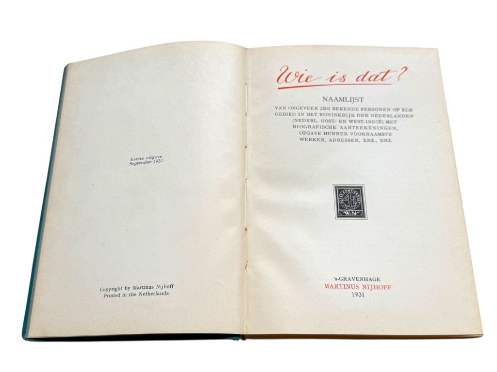 This example of the biographical reference work “Wie is dat?” was published in September 1931 by Martinus Nijhoff in The Hague and comes from the personal possession of the well-known NSB member Max Blokzijl in Berlin.