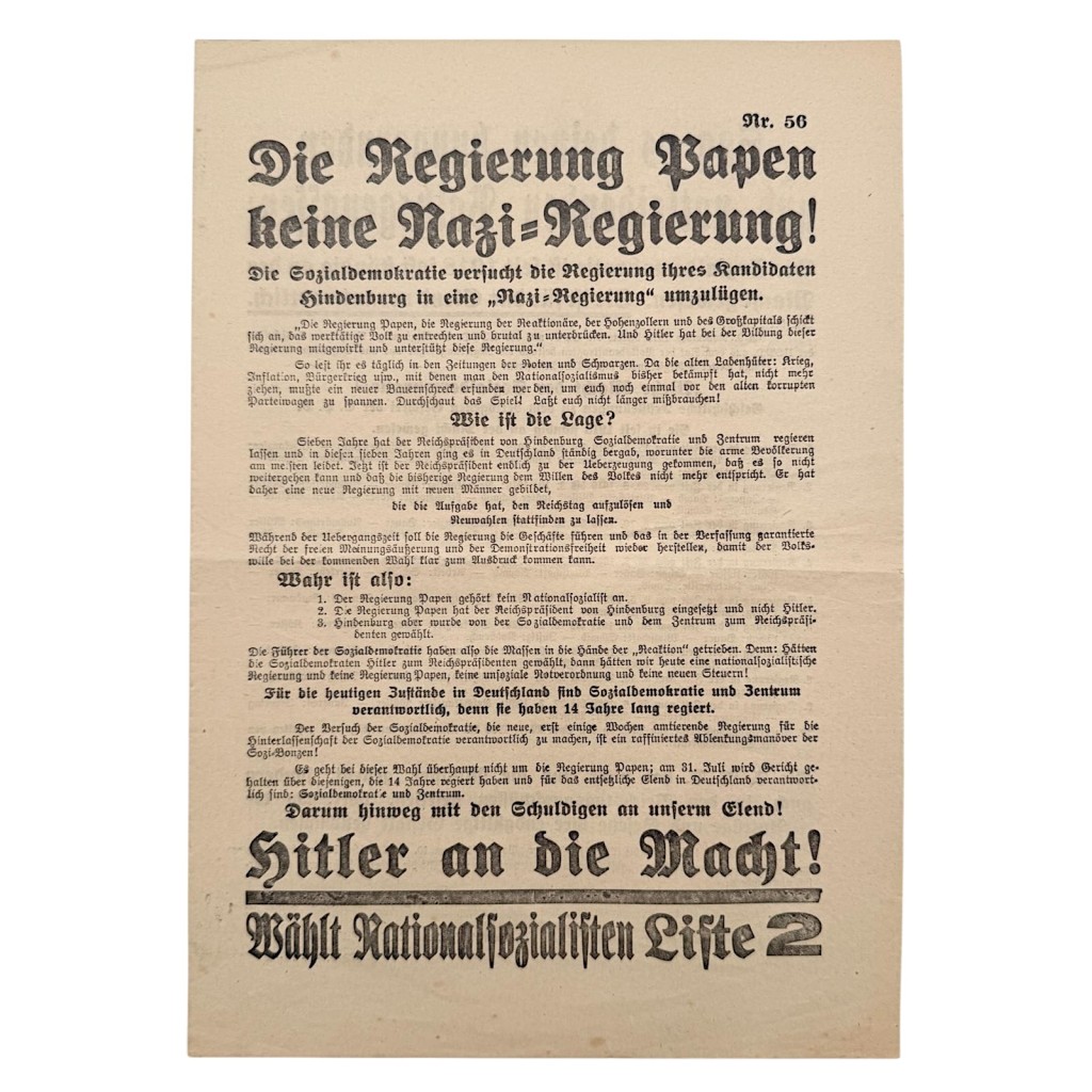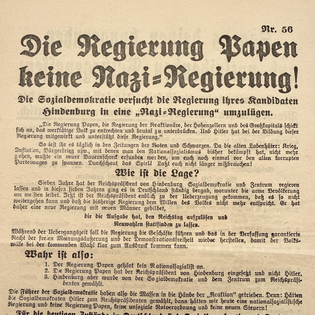 De titel “Die Regierung Papen keine Nazi-Regierung!” en de slogan “Hitler an die Macht!” maken de historische context direct zichtbaar.