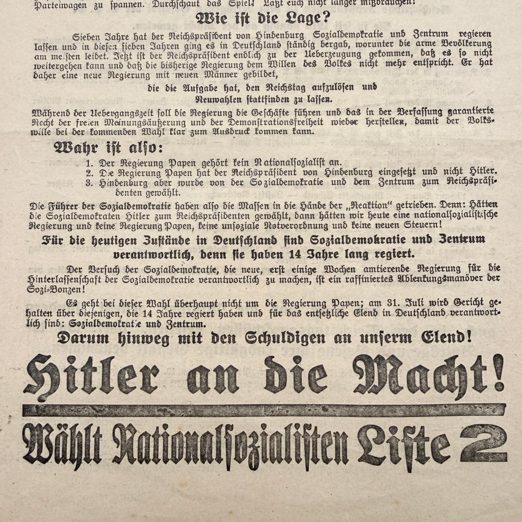 Deze flyer bevat duidelijke politieke teksten gericht op de verkiezingen en roept op tot steun voor de NSDAP en Adolf Hitler.