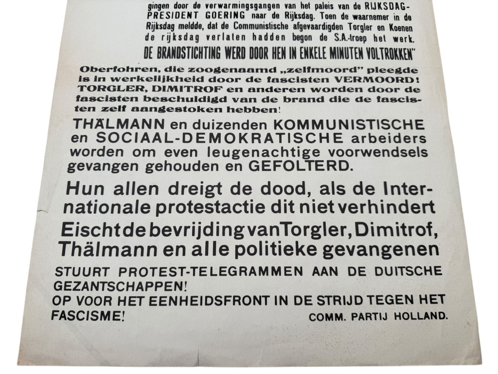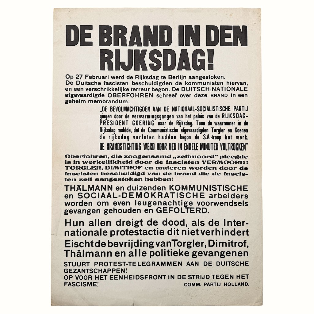 This rare propaganda poster from the Communist Party of Holland (CPH) was issued shortly after the Reichstag fire of February 27, 1933, in Berlin.