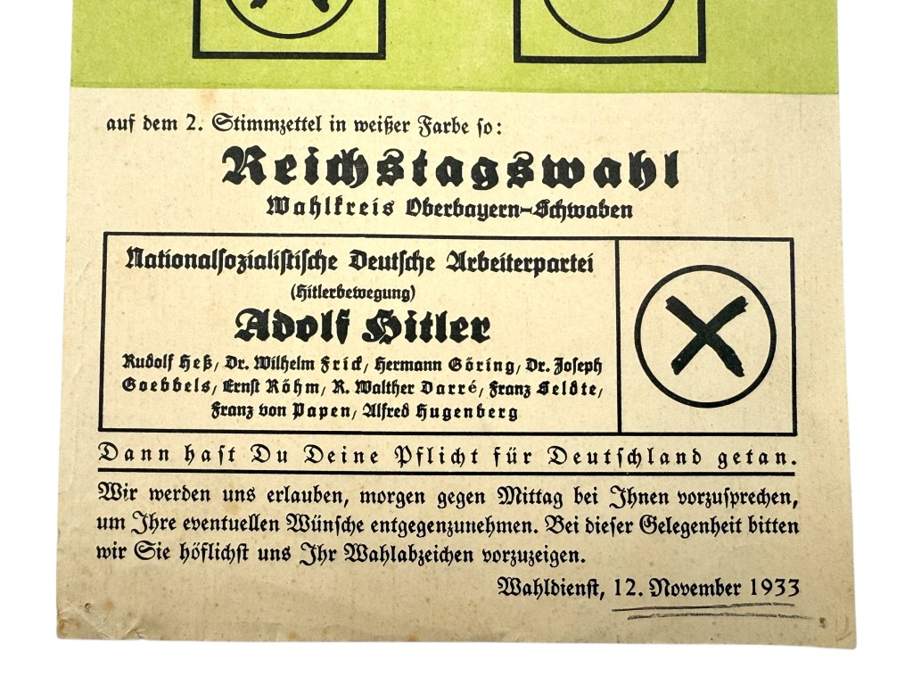 Dit Duitse stembiljet-pamflet voor de Reichstagswahl van 12 november 1933 is een vroeg nationaalsocialistisch propagandadrukwerk zoals dat destijds breed werd verspreid om kiezers te beïnvloeden. Het pamflet toont bovenaan de oproep aan “Wähler und Wählerin!”, gevolgd door duidelijke instructies om op het groene stembiljet “Ja” te stemmen en op het witte stembiljet de lijst van de NSDAP aan te kruisen. Adolf Hitler wordt vermeld, evenals de datum van de stemming en de regio Wahlkreis Oberbayern–Schwaben. Een interessant historisch document voor gespecialiseerde verzamelaars van verkiezings- en propagandamateriaal uit de beginfase van het Derde Rijk.