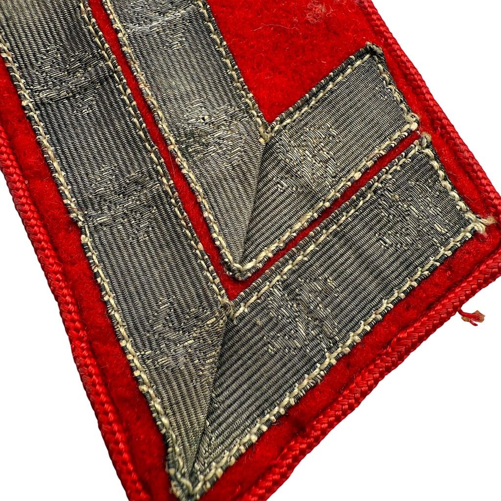 Het rode doek met zilverkleurige Litzen duidt op de rang van Hauptstellenleiter binnen de NSDAP Gauleitung. De kraagspiegel is in gedragen conditie en dit type NSDAP kraagspiegel werd gedragen door partijfunctionarissen op regionaal niveau.
