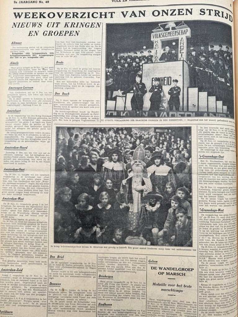Included are detailed reports on NSB party days and mass meetings in, among others, Amsterdam, Wedde and Bilthoven, articles on the relationship between the NSB and the churches, the position of the middle class, unemployment and taxation issues, as well as international developments such as the political situation in Austria and the close ideological orientation towards Germany.