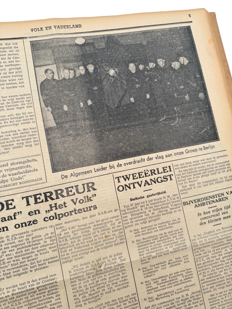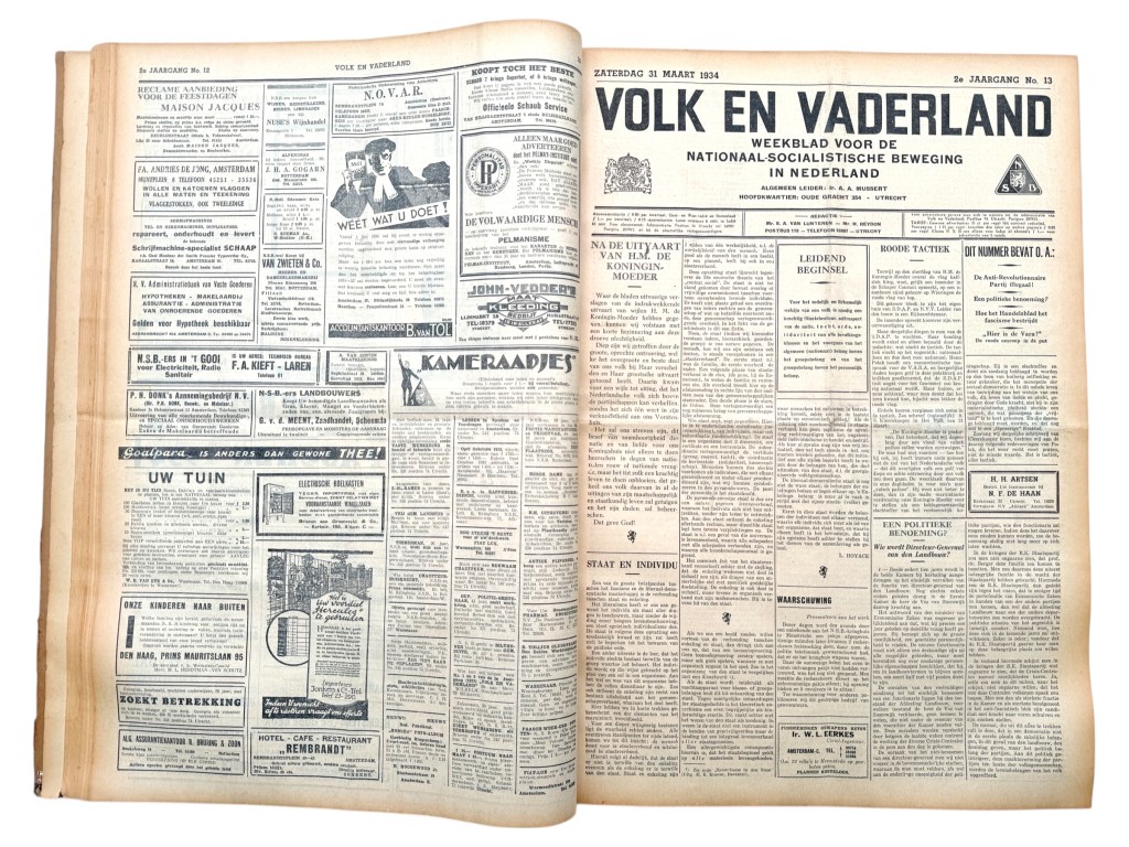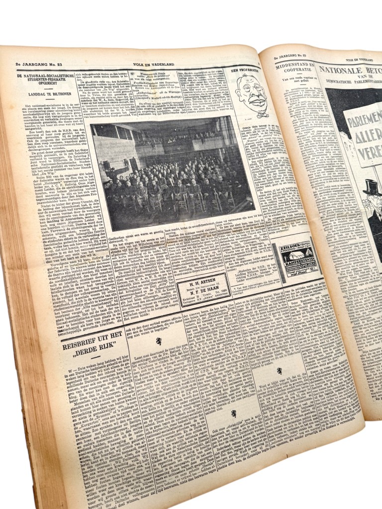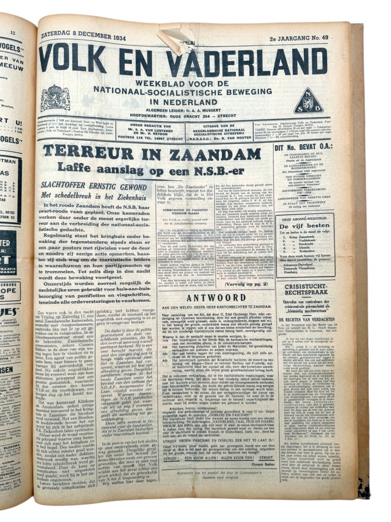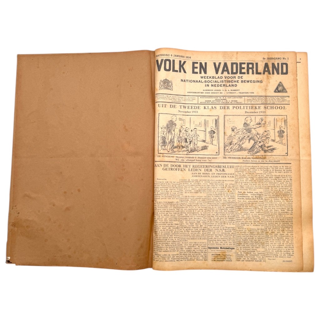 Deze Nederlandse NSB complete ingebonden jaargang (52 nummers) van Volk en Vaderland uit 1934 vormt een indringend en historisch zeer relevant document uit het vooroorlogse Nederland. Het betreft het officiële weekblad van de Nationaal-Socialistische Beweging (NSB), waarin de ideologie, propaganda en organisatie van deze beweging uitvoerig en ongefilterd worden weergegeven. De jaargang bevat talrijke originele uitgaven met een rijk en gevarieerd beeld van de politieke en maatschappelijke spanningen van de jaren dertig. Aan bod komen onder meer uitgebreide verslagen van NSB-landdagen en massabijeenkomsten in onder andere Amsterdam, Wedde en Bilthoven, artikelen over de verhouding tussen de NSB en de kerken, de positie van de middenstand, werkloosheid en belastingvraagstukken, alsmede internationale ontwikkelingen zoals de politieke situatie in Oostenrijk en de nauwe ideologische oriëntatie op Duitsland. Opvallend zijn ook de reportages over geweld en confrontaties, waaronder het uitvoerig beschreven incident in Zaandam, dat de gepolariseerde sfeer van die tijd scherp illustreert. De jaargang is rijk geïllustreerd met foto’s van bijeenkomsten, uniformen, vlagoverdrachten en groepsportretten, aangevuld met politieke spotprenten, advertenties en propagandamateriaal. Daarnaast geven de vele advertenties voor kleding, huishoudelijke apparaten, hotels, muziekuitgaven en lokale ondernemingen een waardevol beeld van het dagelijks leven in Nederland in 1934.