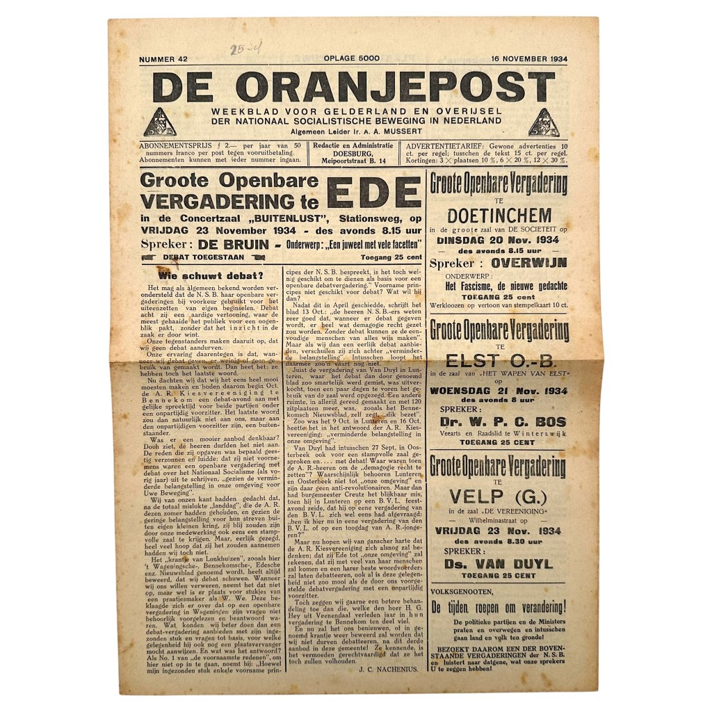 Origineel exemplaar van De Oranjepost, nummer 42, gedateerd 16 november 1934, met een oplage van 5.000 stuks. Dit weekblad voor Gelderland en Overijssel was een regionale uitgave van de Nationaal-Socialistische Beweging (NSB) in Nederland, onder leiding van Ir. A.A. Mussert. In deze periode werd de redactie en administratie gevoerd vanuit Doesburg (Meipoortstraat B. 14). De voorpagina staat in het teken van meerdere aangekondigde Groote Openbare Vergaderingen, onder meer in Ede (Concertzaal “Buitenlust”, Stationsweg) met spreker De Bruin, in Doetinchem met spreker Overwijn, in Elst (O.-B.) met Dr. W.P.C. Bos (arts en raadslid te Winterswijk), en in Velp (G.) met Ds. Van Duyl. Tevens wordt melding gemaakt van bijeenkomsten en activiteiten in onder andere Arnhem, Zutphen, Enschede en Doesburg. Binnenin bevat de krant rubrieken als “Kringnieuws” (Kring 8 Arnhem, Kring 10 Enschede) en “Groepsnieuws”, evenals artikelen over provinciale statenverkiezingen, partijactiviteiten en organisatiezaken. Namen die in deze uitgave voorkomen zijn onder andere H.T. Roelofsen, J.C. Nachenius, en diverse lokale functionarissen en propagandisten. Daarnaast zijn er talrijke advertenties van regionale ondernemers, waaronder G. ter Meulen (Arnhem), W.J. Jansen (Arnhem), G.J. Polder (Arnhem), Chr. Kooy (Waleskooy) – Arnhem, H. Hubers (Arnhem) en J.E.W. van Eldik (Arnhem). Ook wordt reclame gemaakt voor een NSB Kalender 1935 met afbeelding van Mussert. Dit originele krantennummer geeft een duidelijk tijdsbeeld van de politieke en maatschappelijke ontwikkelingen in Nederland in de jaren dertig en documenteert de regionale organisatie en propaganda van de NSB in Gelderland en Overijssel. Een historisch document en interessant verzamelobject voor liefhebbers van vooroorlogse Nederlandse politieke geschiedenis en militaria.