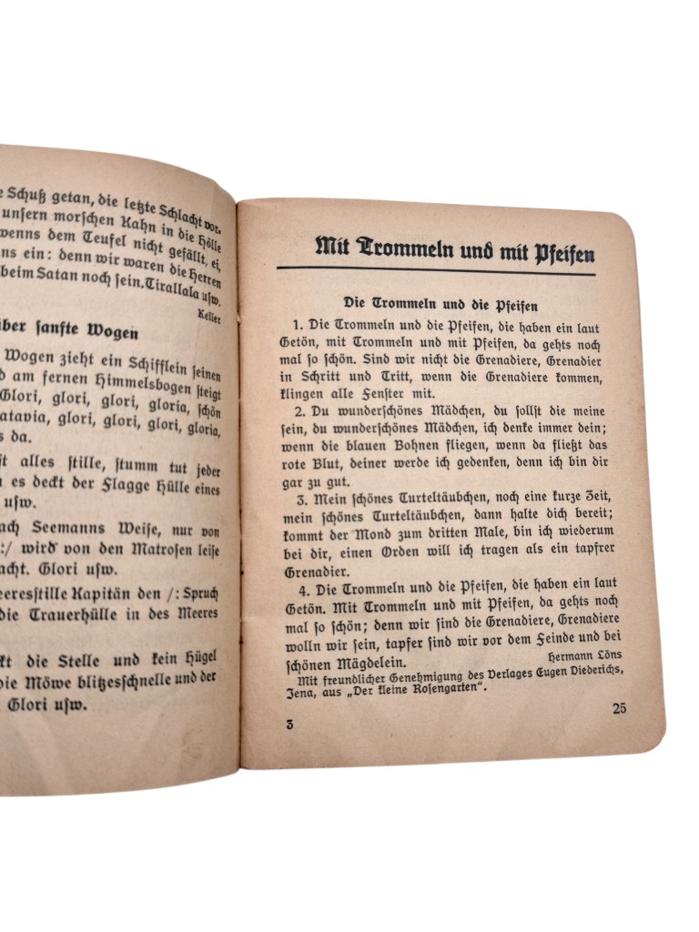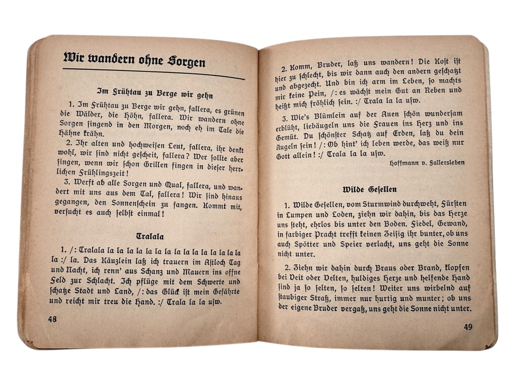 Het boekje bevat talrijke liedteksten die destijds onderdeel vormden van de ideologische en muzikale vorming van de jeugdorganisatie. De linnen omslag en de pagina’s tonen ouderdoms- en gebruikssporen.