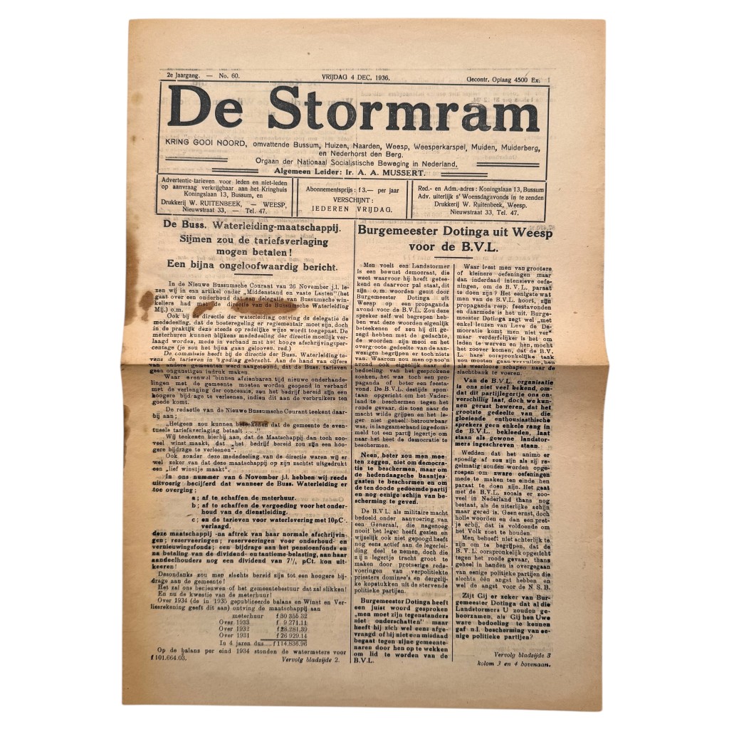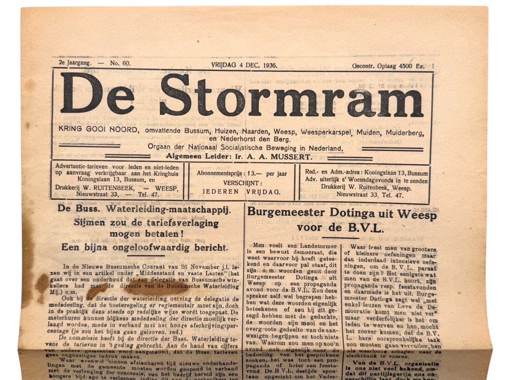 Original local NSB newspaper from 1936, titled “De Stormram”, published as a regional organ of the National Socialist Movement (NSB) in the Netherlands. This issue was intended for Kring Gooi Noord and specifically covered the towns of Bussum, Huizen, Naarden, Weesp, Weesperkarspel, Muiden, Muiderberg, and Nederhorst den Berg. The newspaper represents an interesting historical document from the pre-war years, illustrating how the NSB disseminated its ideology, propaganda, and political viewpoints at a local level.