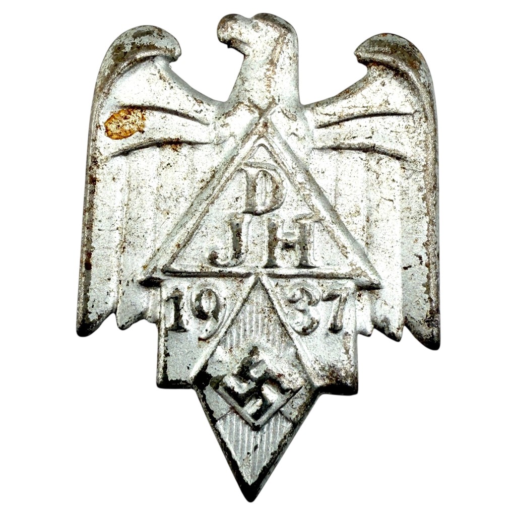The metal pin features an eagle with the triangular DJH emblem and the year 1937, complemented by the swastika.