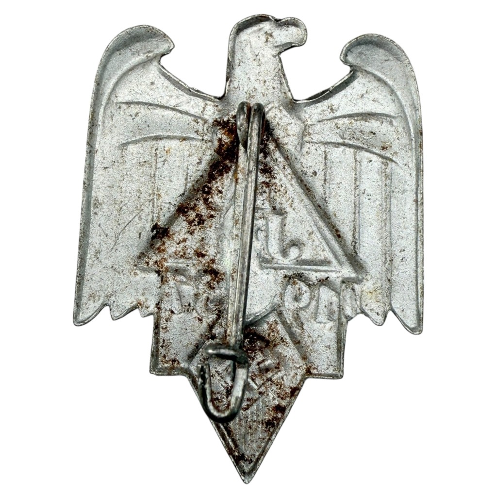 Deze Duitse Hitlerjugend speld uit 1937, gelieerd aan de Deutsche Jugendherbergen (DJH), is een origineel stuk uit de periode van het Derde Rijk. De metalen speld toont een adelaar met het driehoekige DJH-embleem en het jaartal 1937, aangevuld met het swastika. De achterzijde beschikt over het oorspronkelijke veiligheidsspeld-sluitmechanisme. Het exemplaar verkeert in gebruikte conditie met ouderdomssporen.