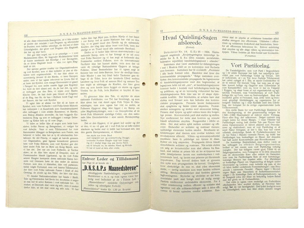 This issue also includes articles such as “Hvad Quisling-Sagen afslørede”, referring to the Norwegian politician Vidkun Quisling, and “Vort Partiforlag”, concerning the party publishing house and propaganda material.