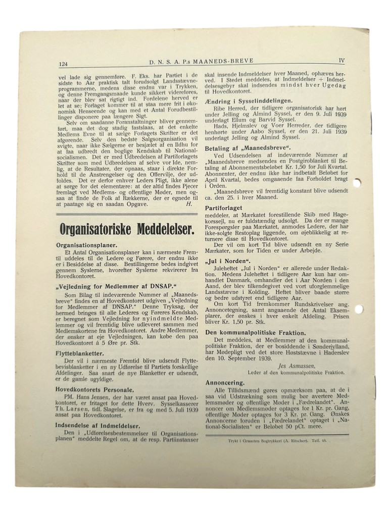 Daarnaast bevat dit nummer artikelen zoals “Hvad Quisling-Sagen afslørede”, waarin wordt gerefereerd aan de Noorse politicus Vidkun Quisling, en “Vort Partiforlag”, over de partijuitgeverij en propagandamateriaal. In de rubriek “Organisatoriske Meddelelser” worden talrijke interne partijzaken behandeld, waaronder personeelswijzigingen, organisatorische herindelingen en mededelingen over afdelingen en sysler (districten). In deze editie worden diverse locaties genoemd, waaronder Kolding, Haderslev, Sønderjylland, Slagelse, Graasten, Ribe Herred, Hjørring, Aabenraa (Aabenraa/Aabenraa Syssel) en andere Deense regio’s. Ook wordt verwezen naar partijactiviteiten in het zuiden van Jutland en organisatorische wijzigingen per 9 en 21 juli 1939. Onder de genoemde namen bevinden zich naast Frits Clausen onder meer Jes Asmussen (leider van de kommunalpolitiske fraktion), Hans Jensen, Th. Larsen, en andere partijfunctionarissen die betrokken waren bij het hoofdkantoor en regionale leiding. Tevens wordt melding gemaakt van publicaties zoals “Jul i Norden” en advertenties in bladen als “Fædrelandet” en “National-Socialisten”. Het blad bevat verder mededelingen over partijfinanciën, contributies (betaling van “Maanedsbreve”), organisatorische richtlijnen voor leden, en propaganda- en uitgeefactiviteiten. Het geheel geeft een helder beeld van de interne structuur, ideologische positionering en organisatorische uitbouw van de DNSAP in de zomer van 1939, kort voor het uitbreken van de Tweede Wereldoorlog. Een karakteristiek en historisch document uit de Deense nationaalsocialistische beweging, interessant voor verzamelaars van Scandinavische politieke geschiedenis, interbellumdrukwerk en Tweede Wereldoorlog-gerelateerde documentatie.