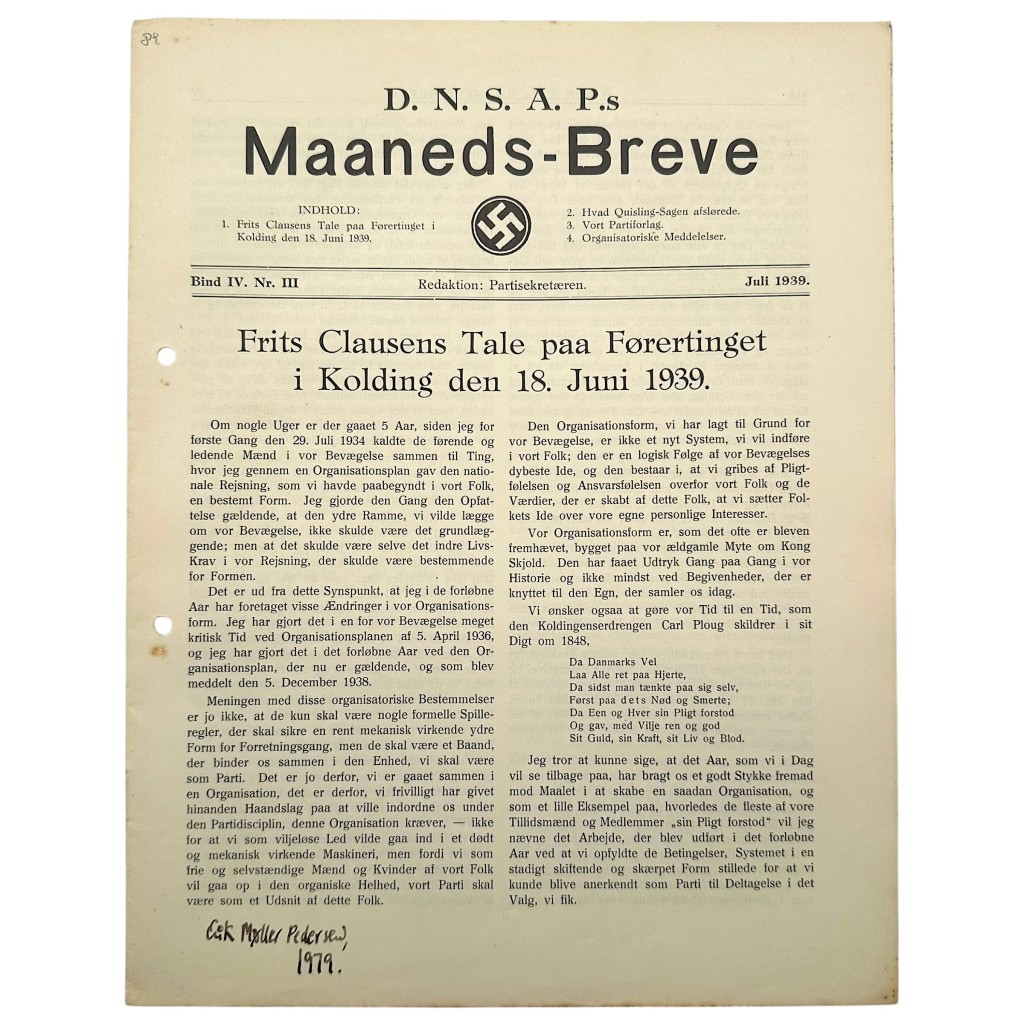 Original example of “D.N.S.A.P.s Maaneds-Breve”, Bind IV, No. III, dated July 1939, issued by the headquarters of the Danmarks Nationalsocialistiske Arbejderparti (DNSAP).