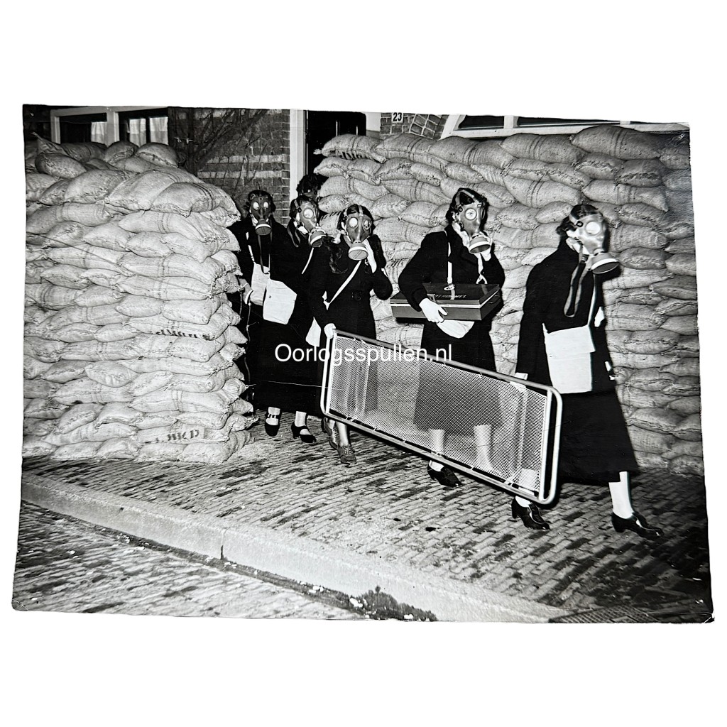 De vrouwen, behorend tot de Eerste Vrouwelijke Hulppbrigade, dragen gasmaskers en evacuatie-uitrusting terwijl ze zich voorbereiden op noodsituaties zoals luchtaanvallen of gasaanvallen, een veelvoorkomend scenario in de aanloop naar de Tweede Wereldoorlog. Een bijzonder beeld van de Nederlandse civiele verdediging vóór mei 1940, met duidelijke verwijzing naar de maatschappelijke paraatheid in de dreigende oorlogstijd.
