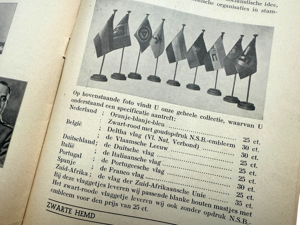 Among the advertised items are the well-known NSB “Zwarthemden” uniforms, ties, nationalist flags, and the Wolfsangel pin in various sizes.