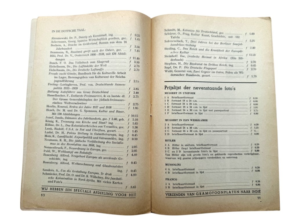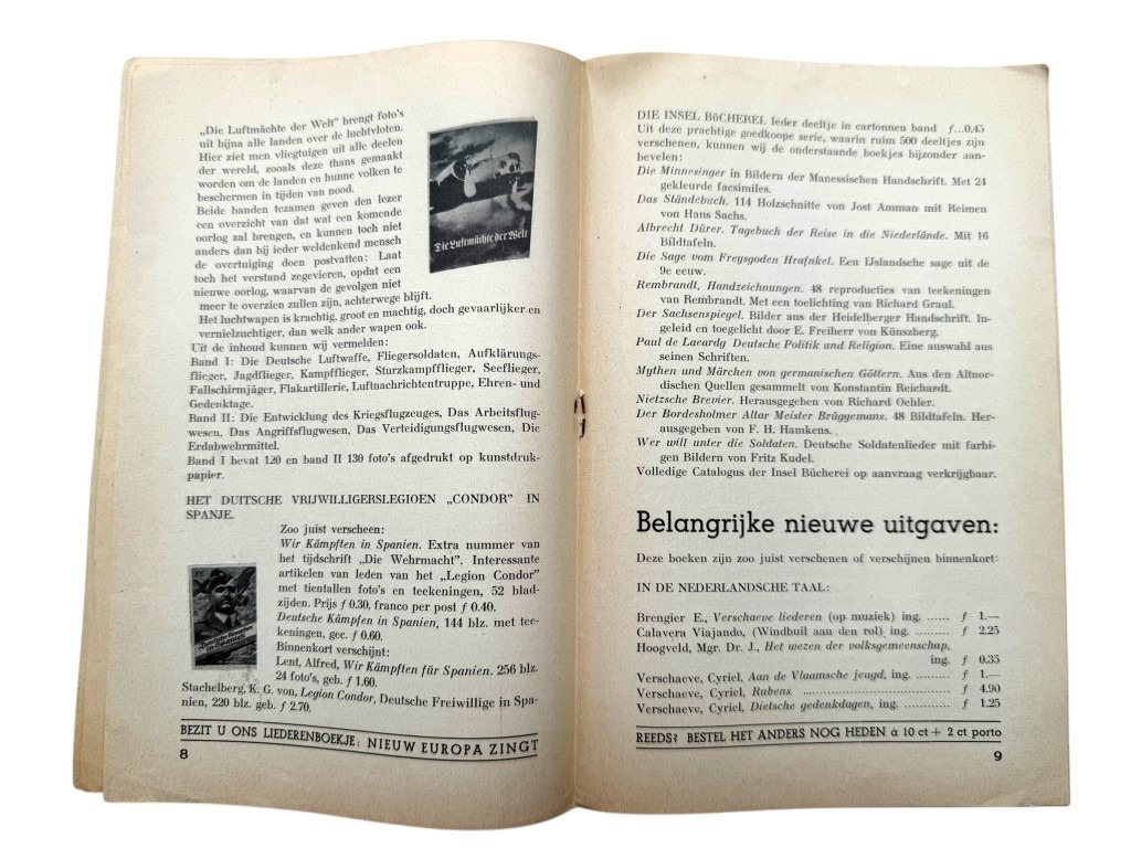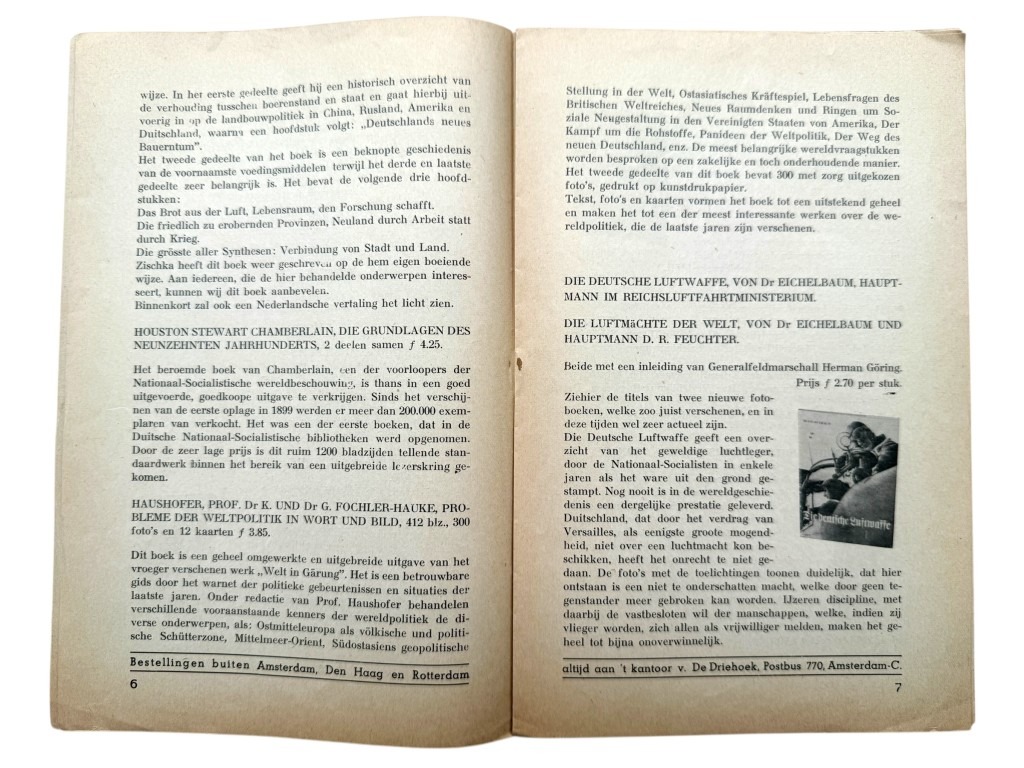 De brochure bevat politieke en ideologische advertenties, propagandistische artikelen en aanbiedingen voor boeken, foto’s, uniformen, speldjes en vlaggen.