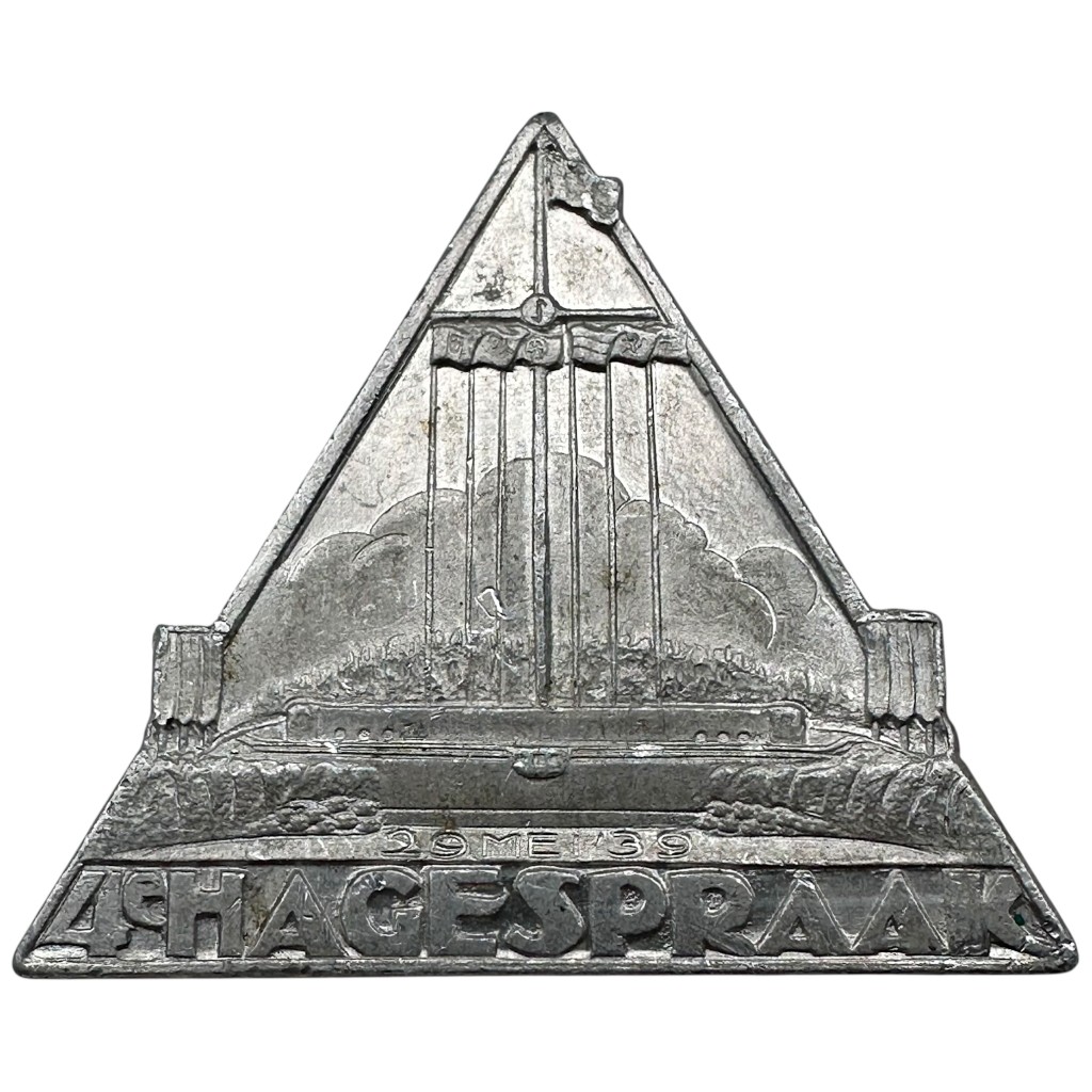 This original Dutch NSB badge commemorates the Hagespraak of 29 May 1939 and is executed in a distinctive triangular shape.
