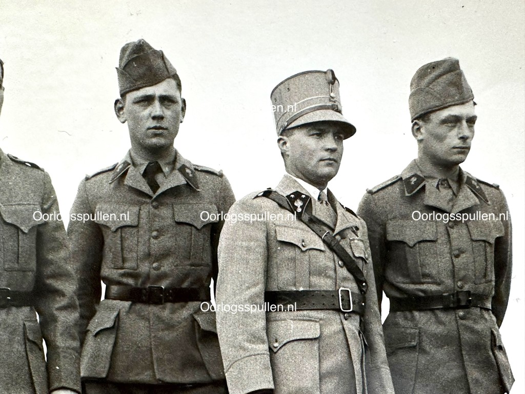 Originele Nederlandse leger foto uit 1940 met daarop militairen in een proefmodel uniform.