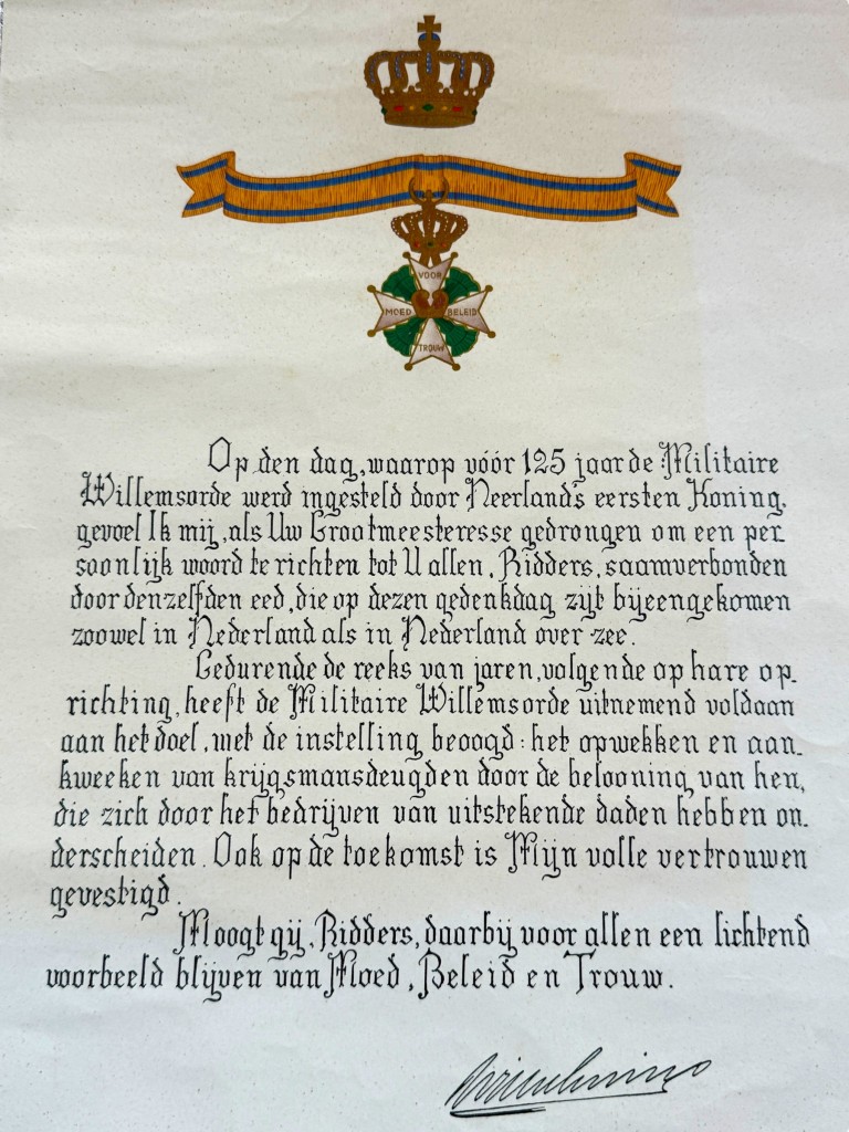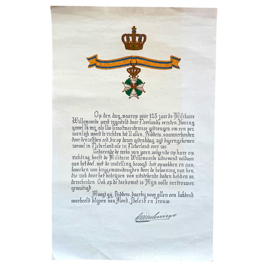 Het grote, sierlijke document toont het karakteristieke kruis van de orde met het motto “Voor Moed, Beleid en Trouw”, omlijst door het koninklijke wapen, de kroon en het bijbehorende lint. De jubileumtekst benadrukt de betekenis en traditie van de Willems-Orde sinds de instelling in 1815 en bevat een gedrukte boodschap van de toenmalige Grootmeesteres, afgesloten met haar faksimile-handtekening.