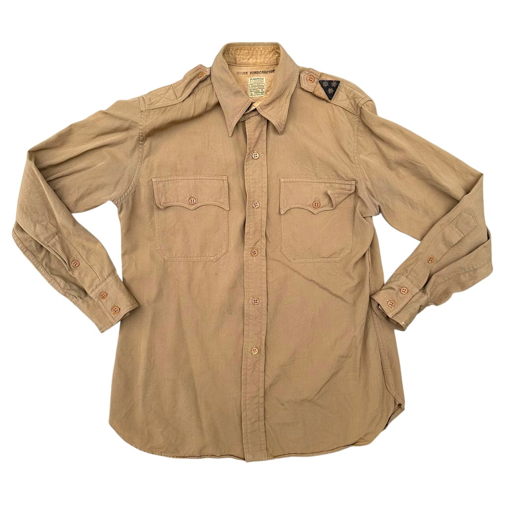 Op de schouder bevindt zich een rangonderscheiding met drie metalen sterren, wat duidt op de rang van kapitein binnen het KNIL. In de kraag is de naam “Bruce Vonderheydt” gestempeld. Aan de binnenzijde bevindt zich een label met de tekst “Furlough – 100% Virgin Wool Gabardine – Form Fitted – London Shrunk – Tailored by Jackson Raymond Co., Inc.”, wat wijst op een kwalitatief vervaardigde officiersblouse.