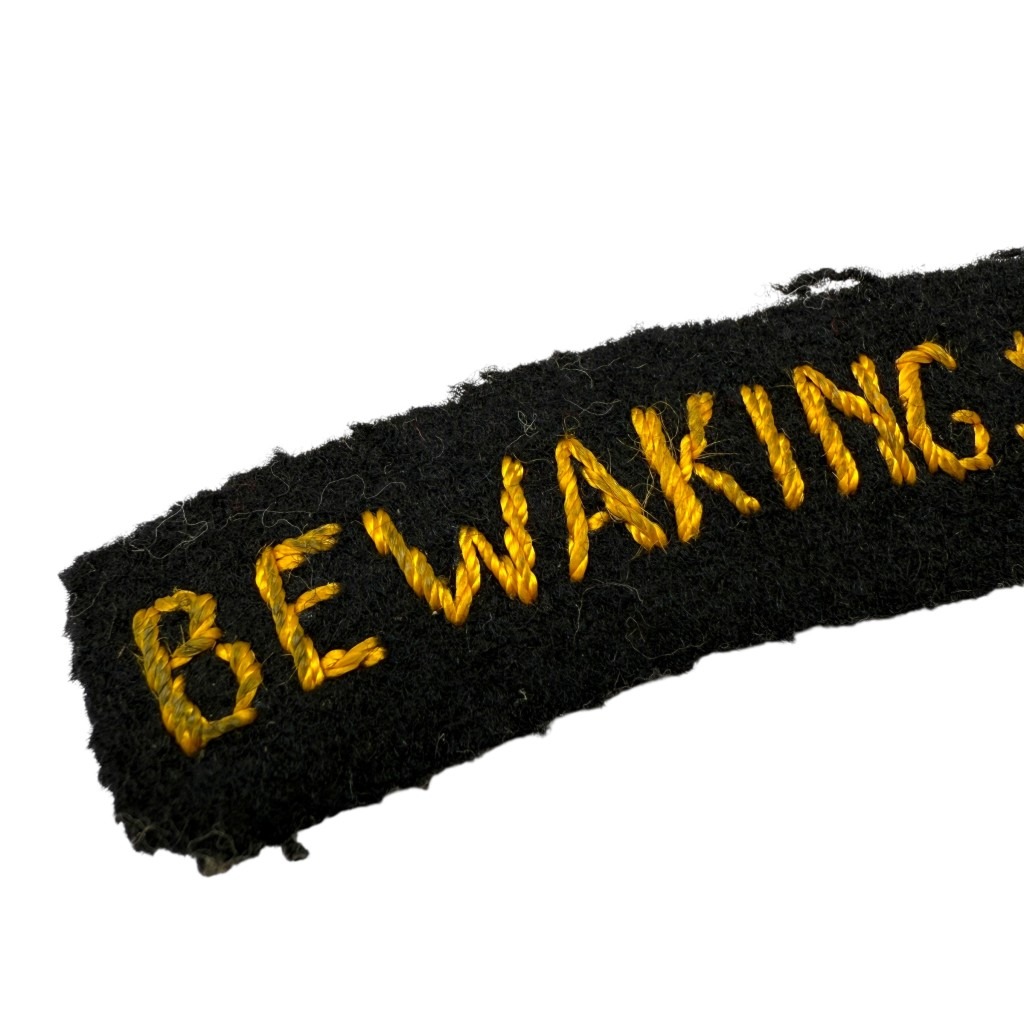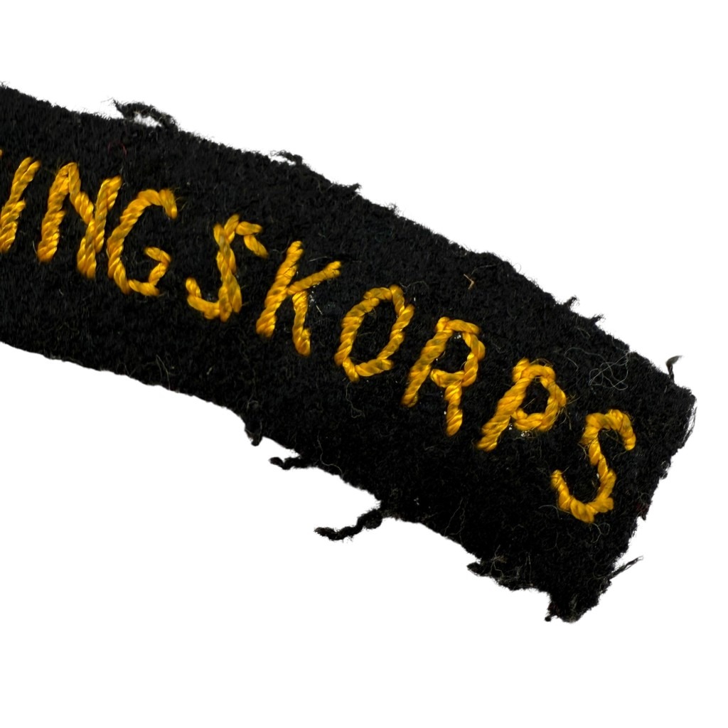 The insignia is made of black cloth with the word “BEWAKINGSKORPS” hand-embroidered in yellow letters in an arched shape.