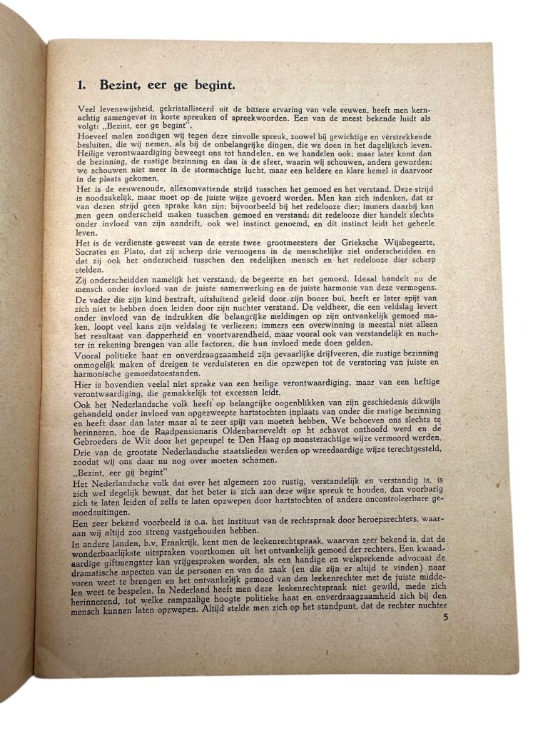 Deze brochure Heftige verontwaardiging en rustige bezinning (Arnold Meyer e.a., 1945) verscheen kort na de Tweede Wereldoorlog en bevat beschouwingen over juridische en maatschappelijke vraagstukken die direct na de bevrijding actueel waren. De uitgave behandelt onderwerpen zoals illegaliteit binnen de rechtspraak, de arrestatie en behandeling van politieke gevangenen, hun rechtspositie, landverraad, oorlogsmisdaden en collaboratie. De teksten zijn het resultaat van studiebijeenkomsten van juristen, een theoloog en een zakenman, en bieden inzicht in het vroege naoorlogse debat rond recht, verantwoordelijkheid en zuivering. Een interessant document voor verzamelaars en onderzoekers van juridische en maatschappelijke ontwikkelingen in het Nederland van direct na de oorlog.