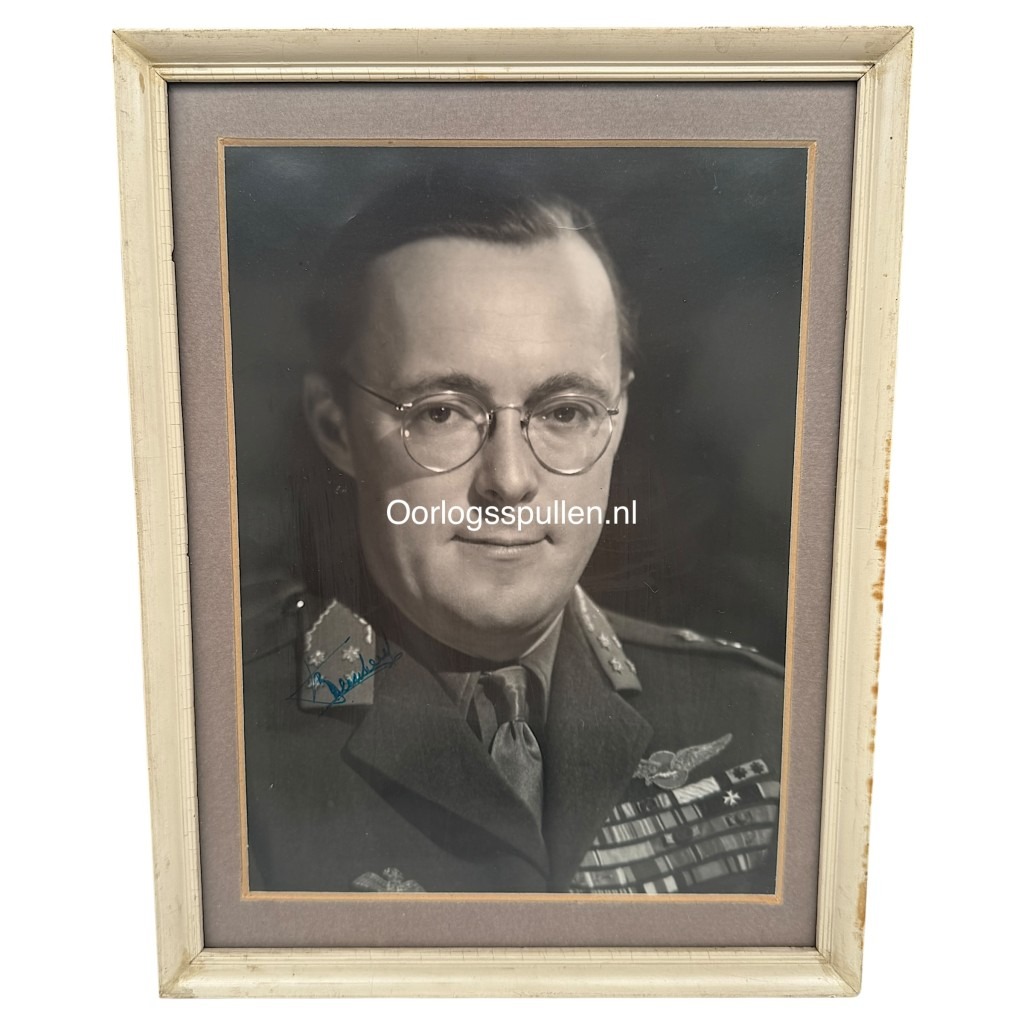 Deze Nederlandse ingelijste portretfoto van Prins Bernhard in uniform is in goede conditie en bevat zijn originele handtekening.