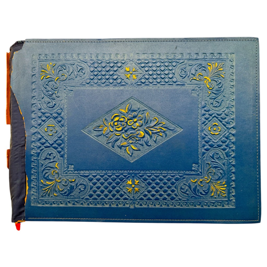 The album concludes with photographs of the album itself: a blue, richly decorated cover with gold accents and cord binding, visibly used yet carefully preserved.