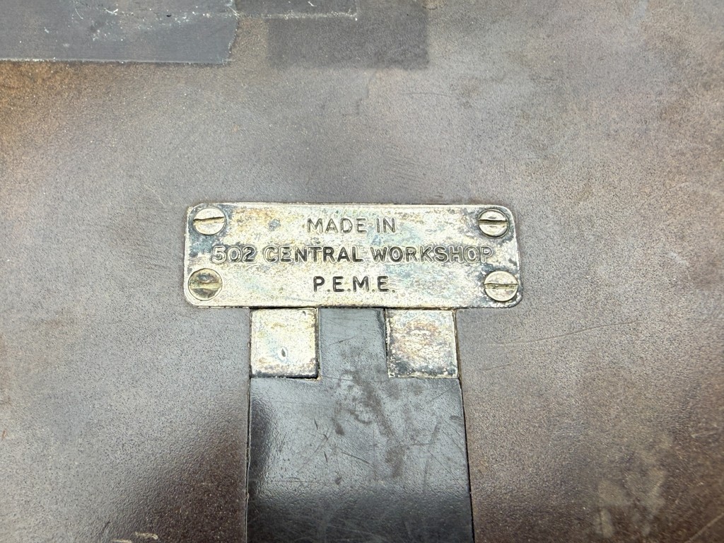 De achterzijde draagt een makerplaat van een militaire werkplaats, wat de herkomst bevestigt.