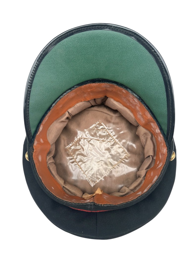 Het interieur toont een leren zweetband met stoffen voering en een transparant naamkaart vakje zoals gebruikelijk bij officieren petten uit de naoorlogse periode.