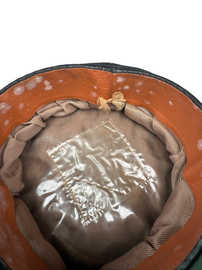 The interior shows a leather sweatband with fabric lining and a transparent name tag pocket typical for post-war officer caps.