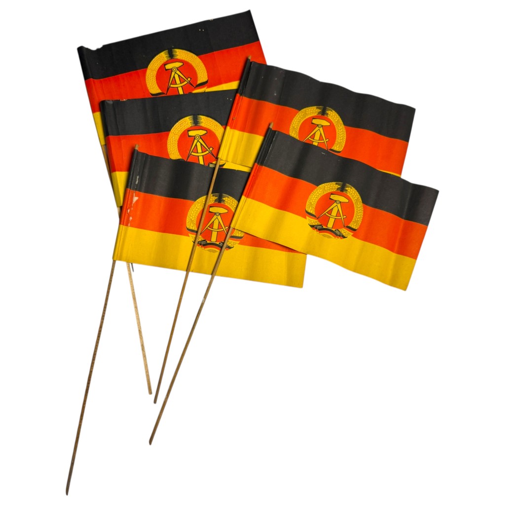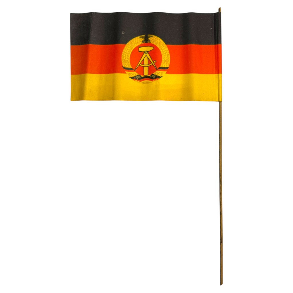 The flag is printed on thin paper and attached to a wooden stick, as was customary during official parades, national holidays, and political demonstrations organized by the Socialist Unity Party (SED).