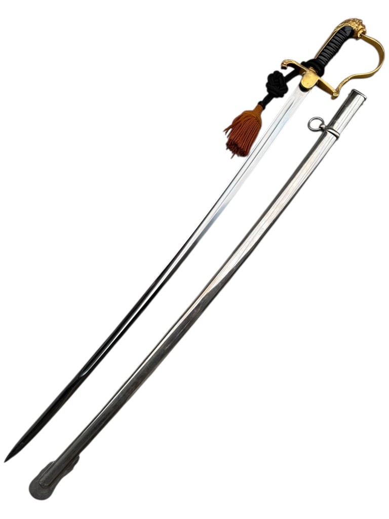 Dutch officer’s sabre with the characteristic gilt lion’s head, dating from the period after the Second World War. This representative model features a curved, polished blade and an elaborately decorated hilt with a lion’s head pommel, gilt guard, and black wire-bound grip. The sabre is complete with its metal scabbard and tassel, consistent with ceremonial and uniform-related use by Dutch officers.